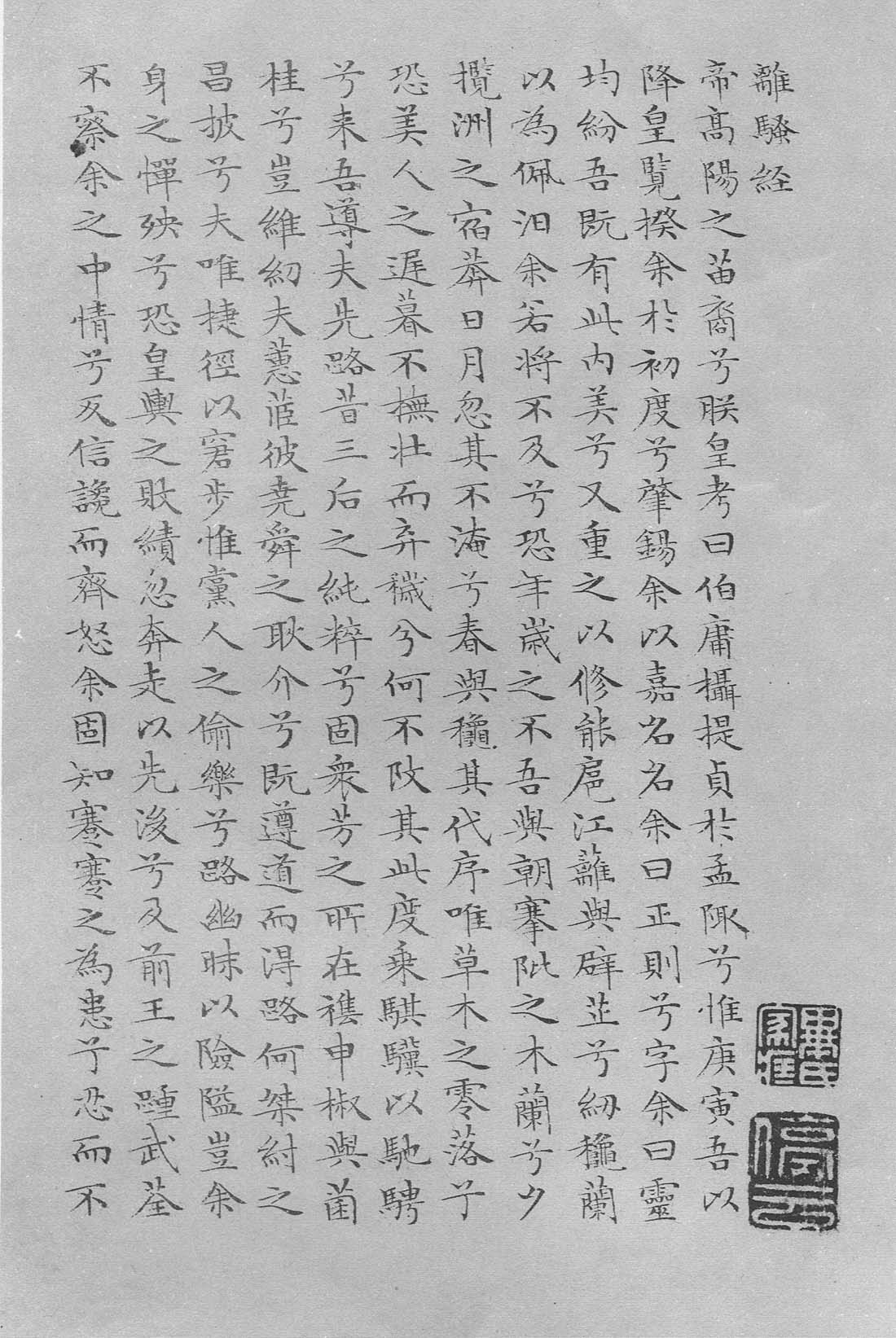 文徵明一生写过多少小楷《离骚经》,我们不可得知。2006年春,我有幸在广东美术馆二楼展厅里亲眼目睹到此件小楷精品原件,不由得被深深感动——什么叫“蝇头小楷”?今天算是见识了!作品自署乙卯年(1555年),此时文徵明已86高龄,展现在眼前的这件小楷每字不足0.5厘米,一笔(简直就是“丝”)不苟,字字精爽,细腻而不纤弱,秀美却无散漫之处,法度严谨又绝不呆板,令人叹为观止。之前或认为文徵明小楷过于平实,不够强烈,甚至觉得他用笔单调,千篇一律,就是“馆阁体”,然而欣赏到如此精湛的小楷原作,作品里透出的那份“沉静”,怎能不令你震撼?