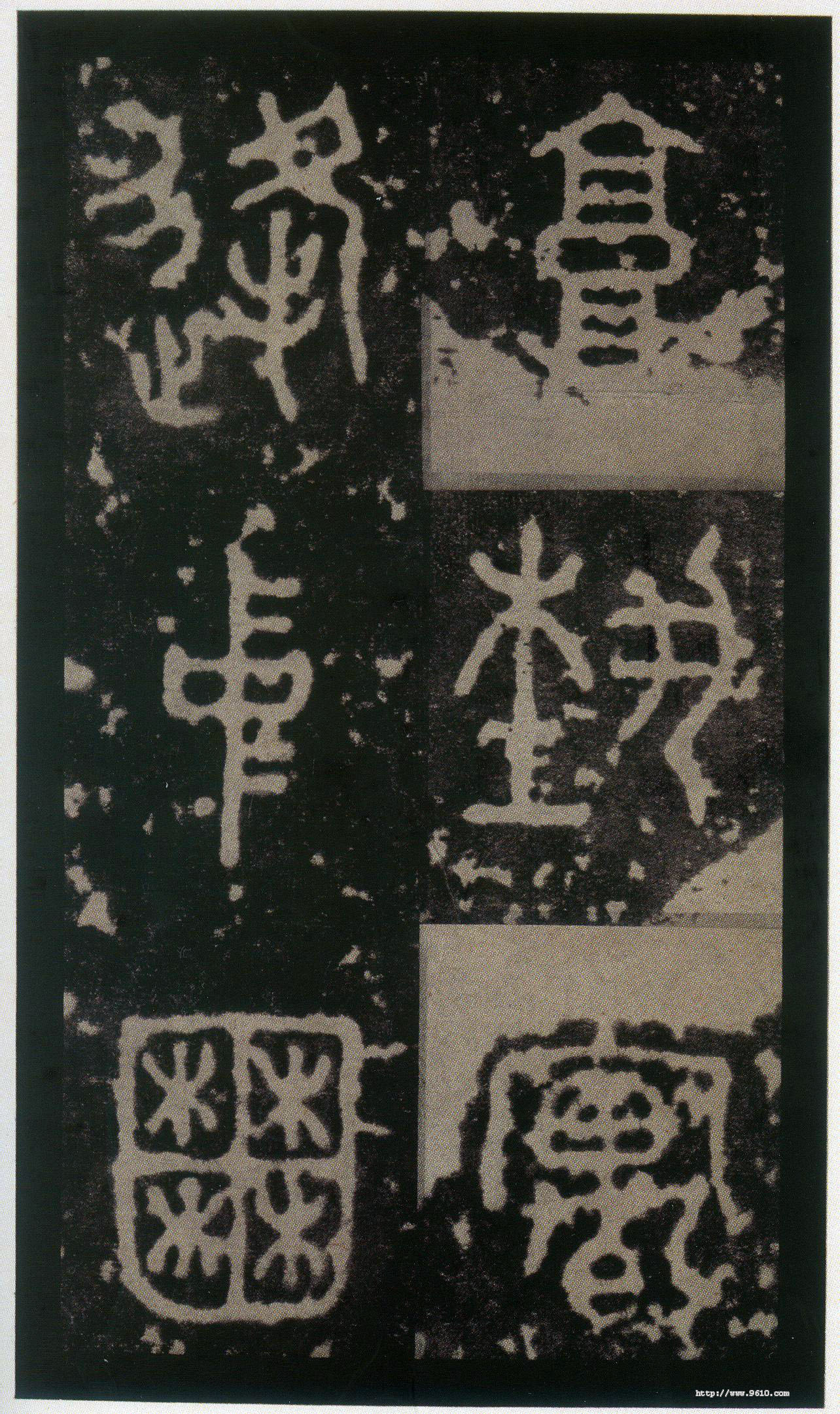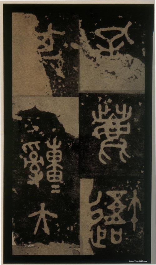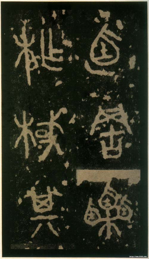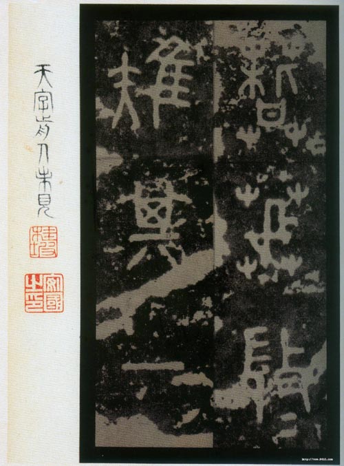 石鼓文(先锋本)(北宋拓) 各纵18.0厘米 横10.4厘米,日本东京三井纪念美术馆藏。《先锋本》分上下二帖,每页两行,行三字,存四百八十字。(见于2006年上海博物馆《中日书法珍品展》)