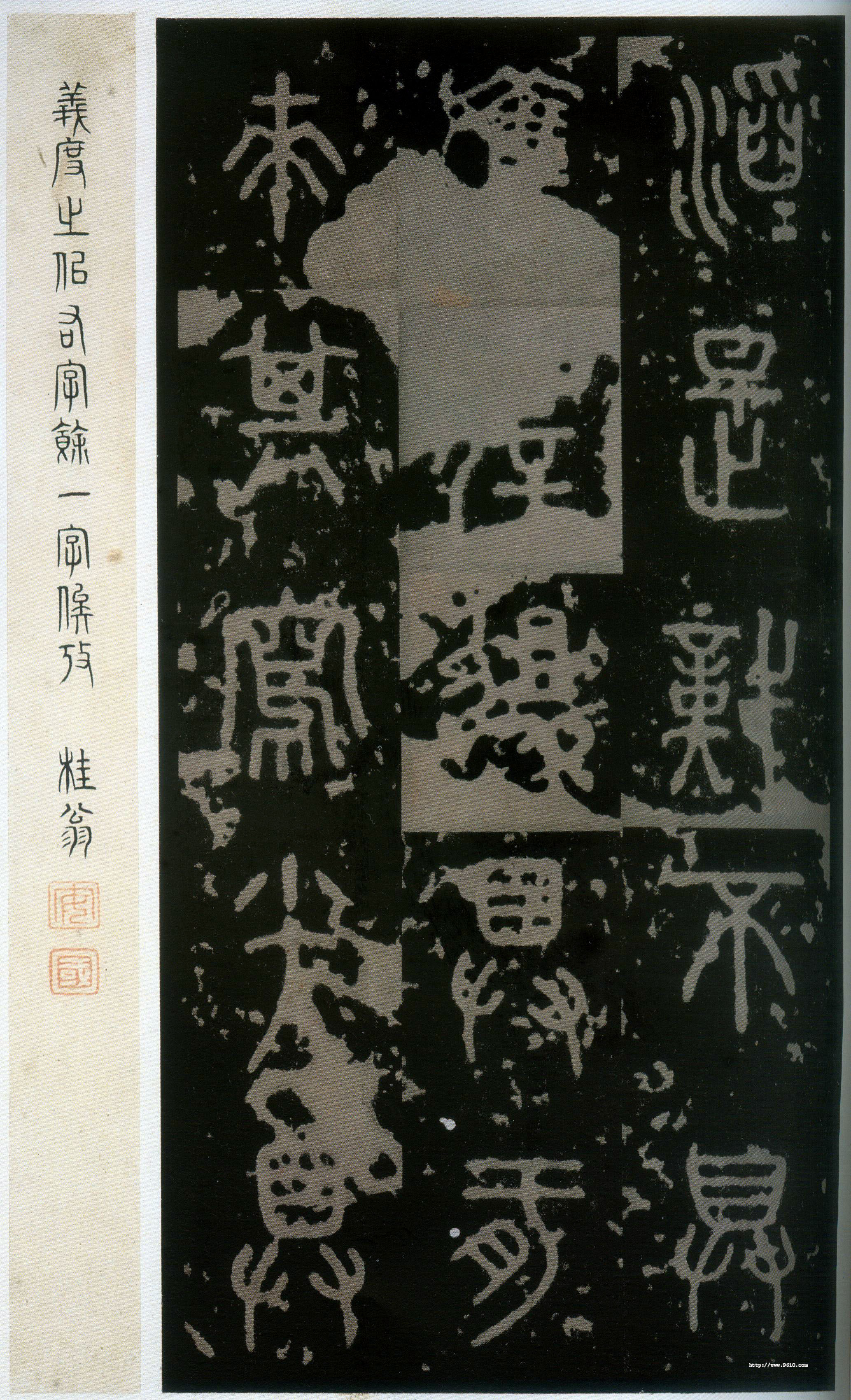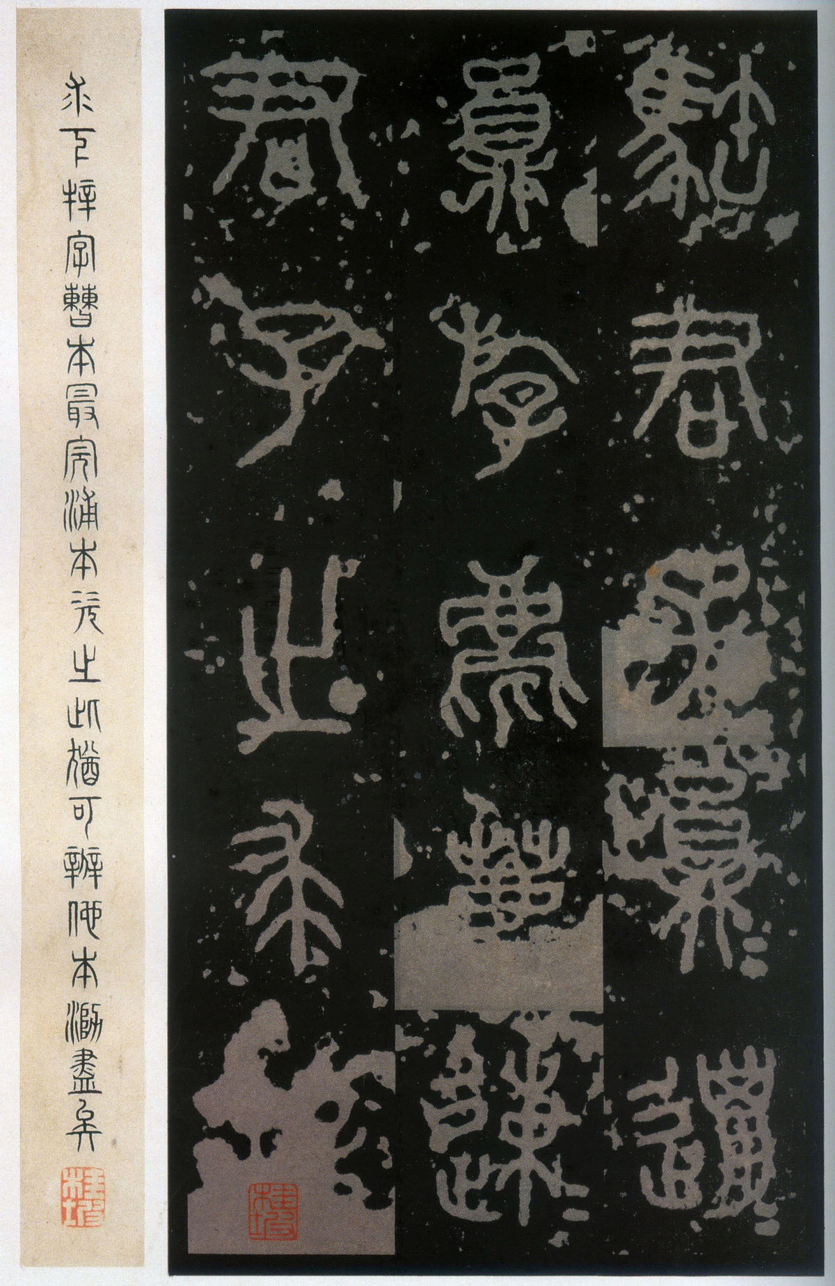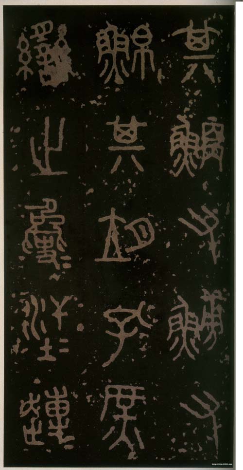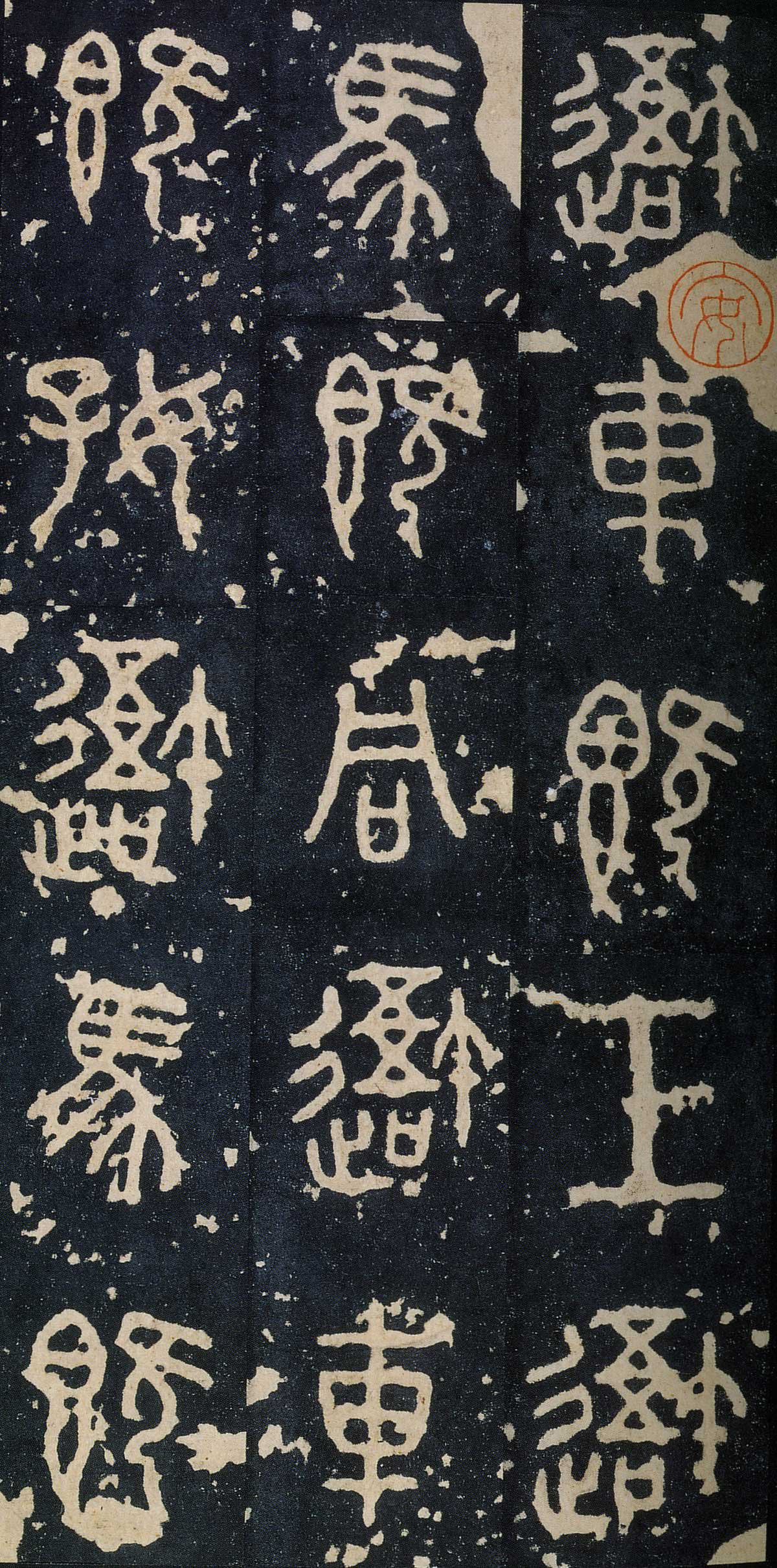 石鼓文(中权本)(北宋拓) 各纵28.0厘米 横14.5厘米,日本东京三井纪念美术馆藏。每页三行,行五字,存四百九十七字。(见于2006年上海博物馆《中日书法珍品展》)
