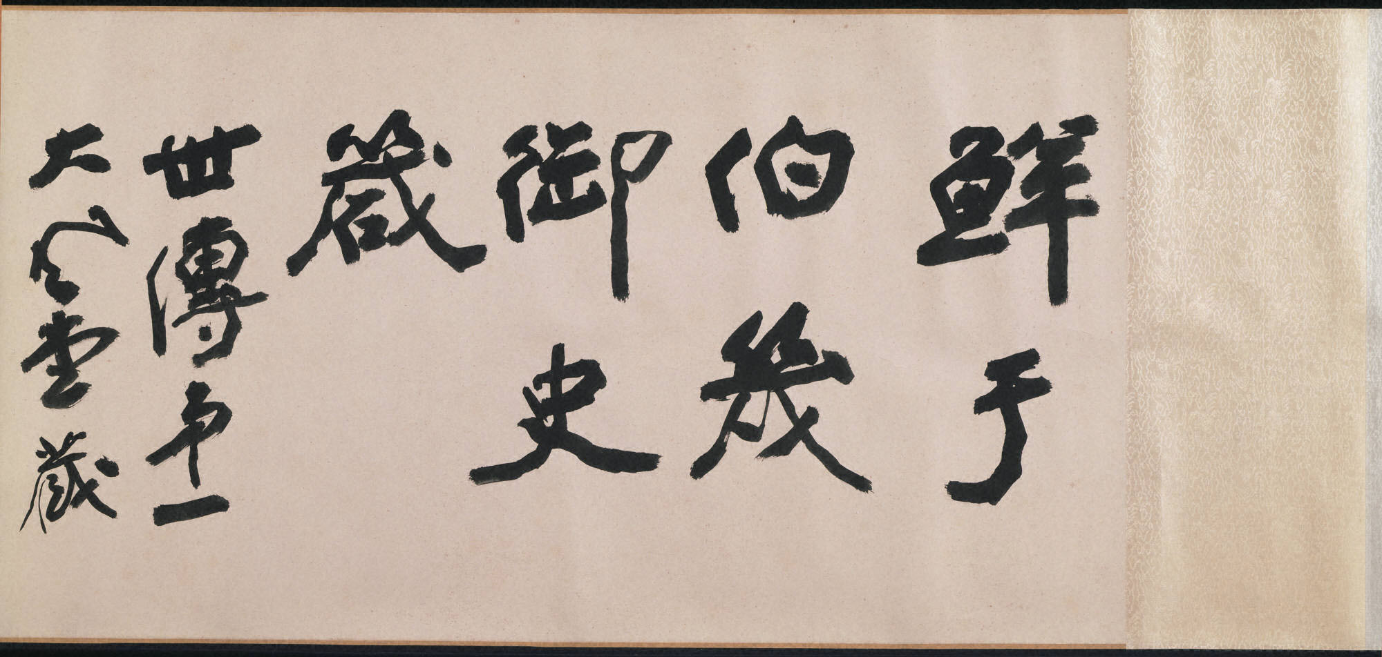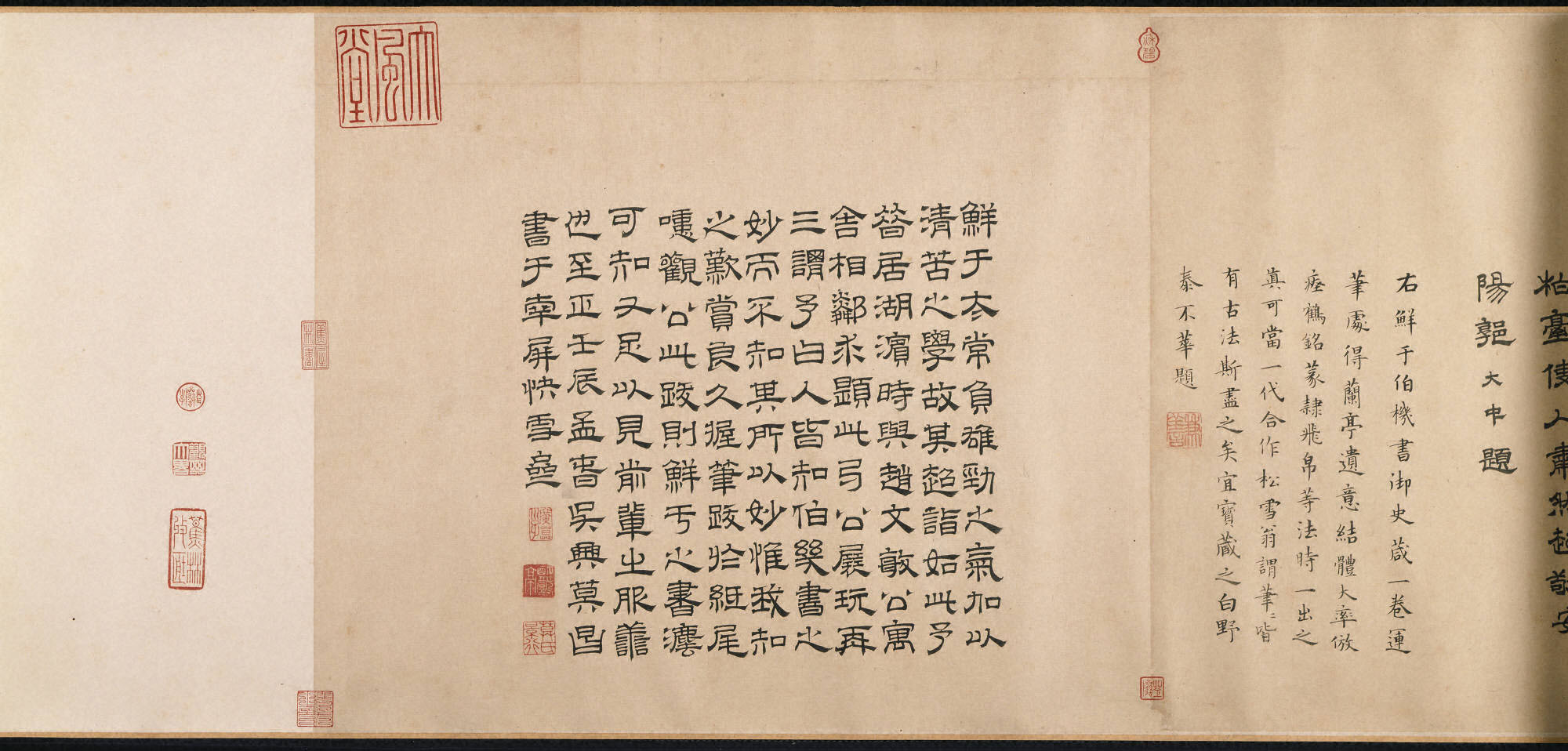 鲜于枢楷书《御史箴卷》,大德三年(1299)作,纸本。卷后有赵孟頫、邓文原等人的题跋。此卷运笔沉雄朴茂,不事雕琢,而风华自在。赵于此卷推崇备至,跋曰:“伯机书,笔笔皆有古法,足为至宝。”