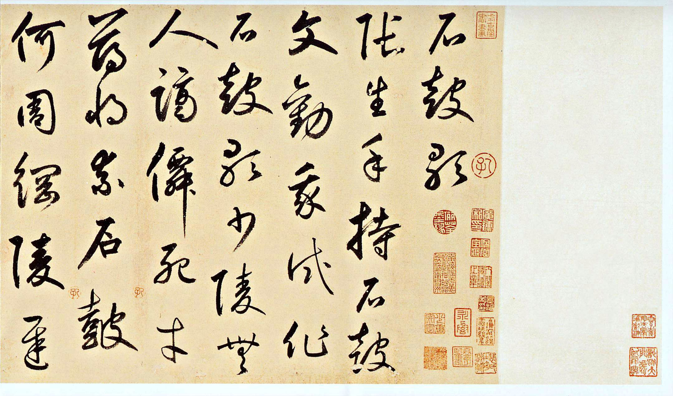鲜于枢墨写《石鼓歌》传世有两本,一部作于元大德五年,现存于美国大都会博物馆,其二为2004年6月26日由北京翰海推出,最终以人民币4,620万元成交的作品。
