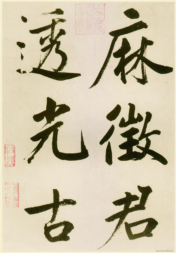鲜于枢《麻徵君透光古镜歌》,纸本,大字行楷,剪装成册,此册为破行剪装成册,从鉴藏印来看,改装当在入清内府以前梁清标所为,原装饬形式已无法知道。