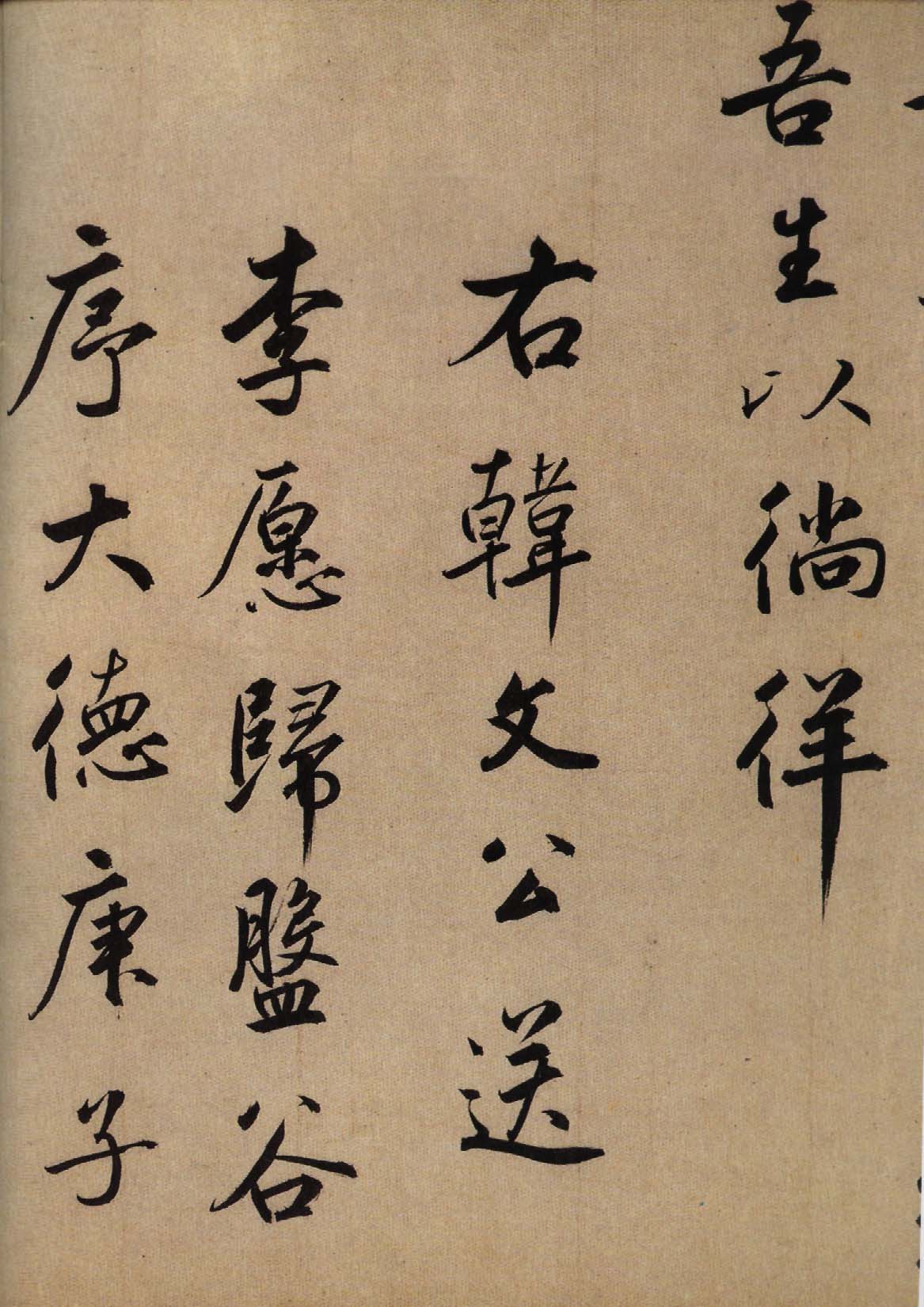 此卷《韩昌黎送李愿归盘谷序》,行句系自"夫前呵从者塞途"起(据《韩昌黎集》),其前尚缺一百零八字。有"清森峭劲、风骨棱棱"之评。此卷书于大德四年(1300),残本。作者时年四十五岁。