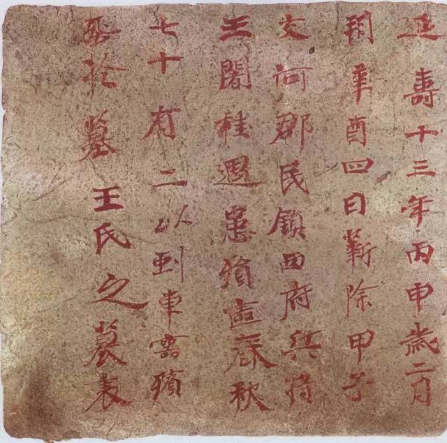 《王阇桂墓表》砖,朱笔,纵35.3×横36×厚3.7厘米。北京故宫博物院藏。 高昌延寿十三年(唐贞观十年,636年),朱书六行五十四字。