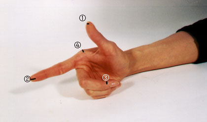 执笔的手作“手枪形状”,中指、无名指、小指自然弯曲,窝向掌心,掌心要空。然后按照“捏”、“托”、“垫”、“靠”四字依次将笔杆靠紧上述四点,