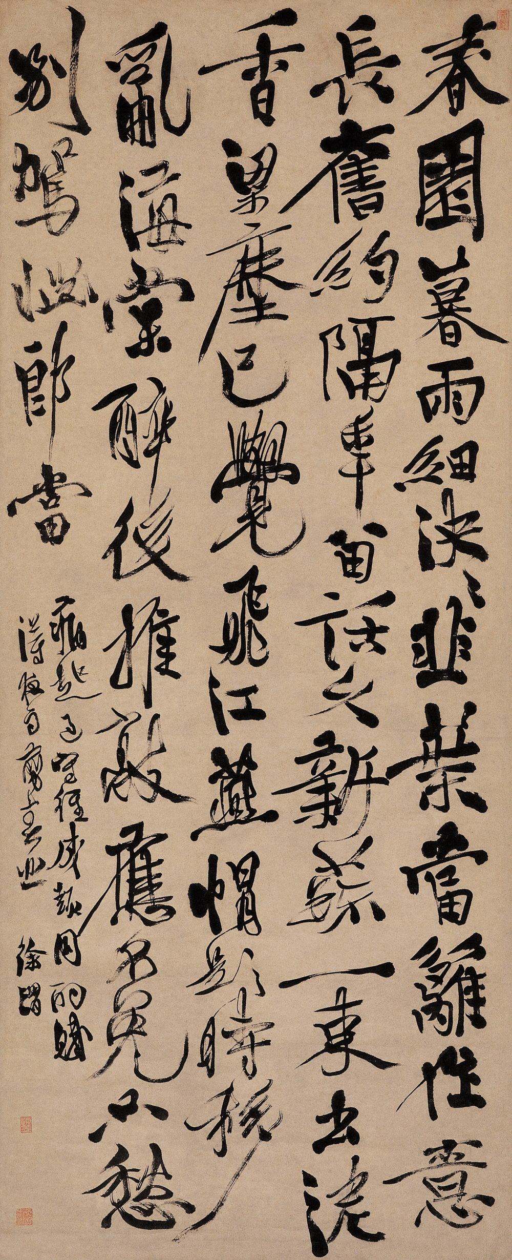 按语:青藤老人天才超逸而不为世用,终因抑郁而至狂疾。其诗文书画都超越时流,以其奇气、豪气、逸气摄人心魄,为后世所推重。此《自书诗》点重行疾,一气呵成,结体似山谷,行笔似元章,而跳踯奇桀不羁拘於法度的神气,已卓然於古人之外,自立奇境,这种将个性张扬到极至的书风,对王铎、傅山等人产生了非常大的影响。袁中郎称他“诚八法之散圣,字林之侠客”可说是的评。这幅行书所录七言诗,北京故宫博物院藏有其草书之作,惟首句略不同,读者可资以比较。