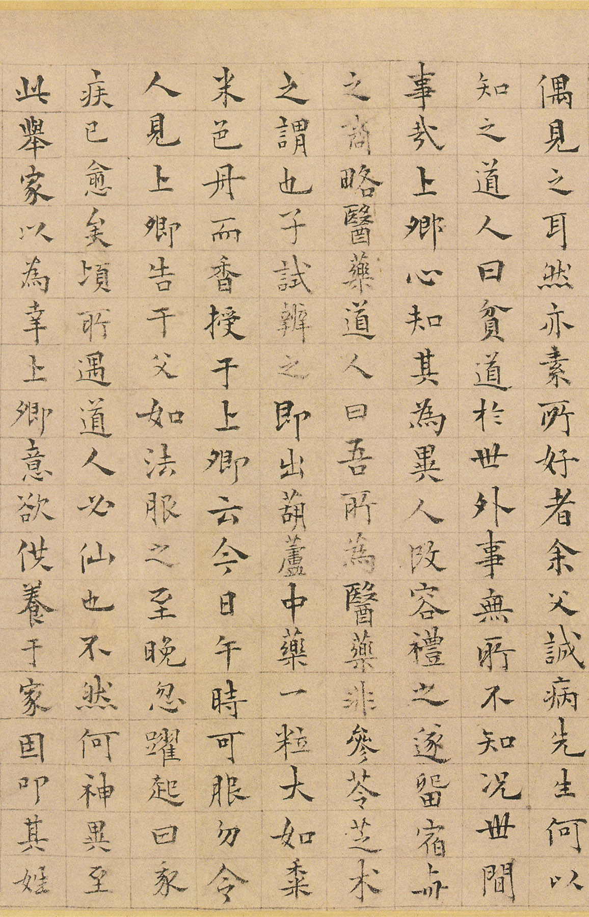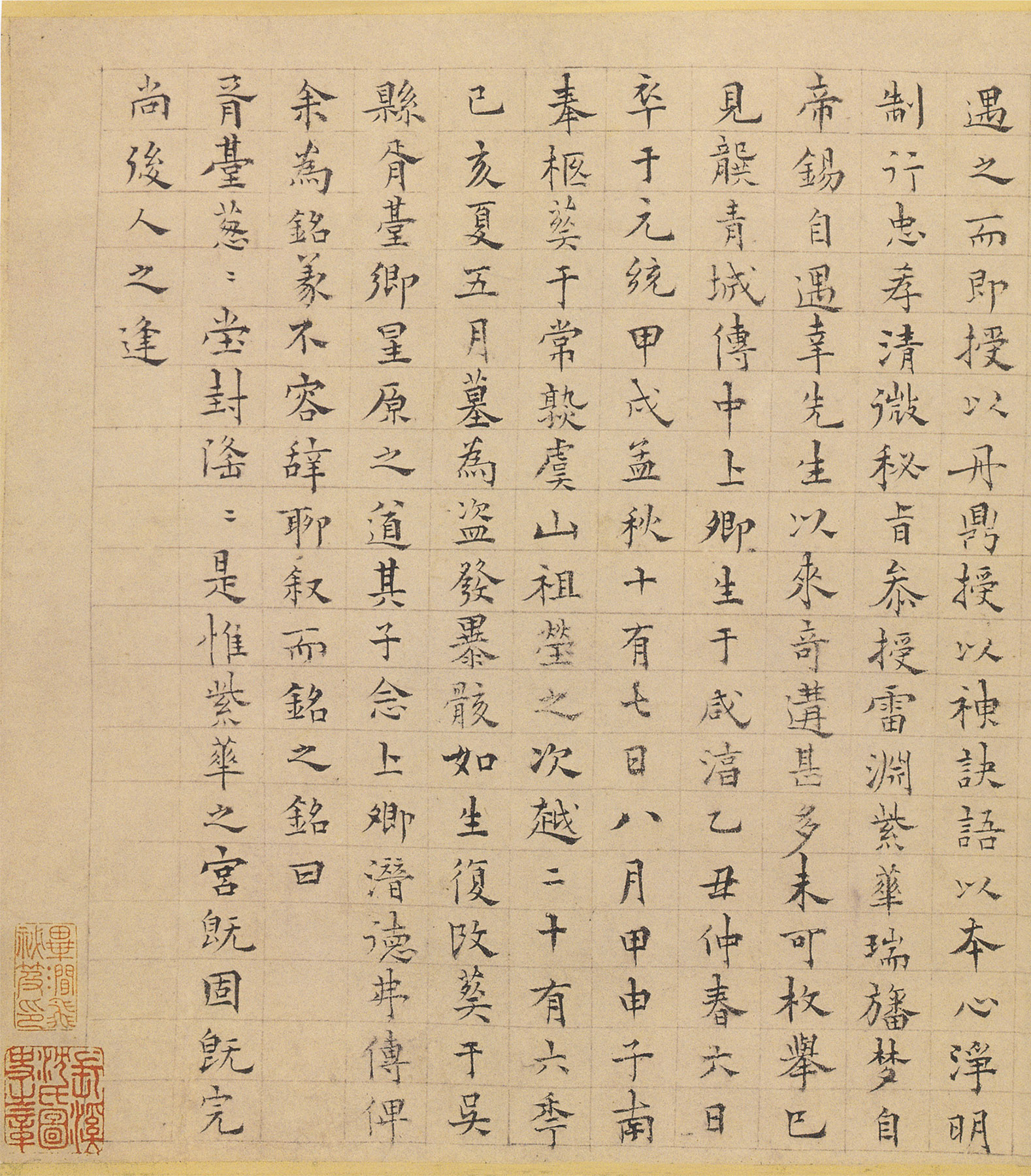 《周上卿墓志铭册》,纸本,纵25.9厘米,横86.2厘米。这是至正十九年(1359)杨维祯应友人周上卿之请所撰写的墓志铭文。所撰行文简洁生动富于性情,充分显示了杨氏出色的文学才华。文字小楷书为摹勒上石之底本,但见用笔稳健劲险,结体端严精准。值得称道的是,通篇因笔致挺健多用挑笔,而愈显气息连贯满幅生机。
