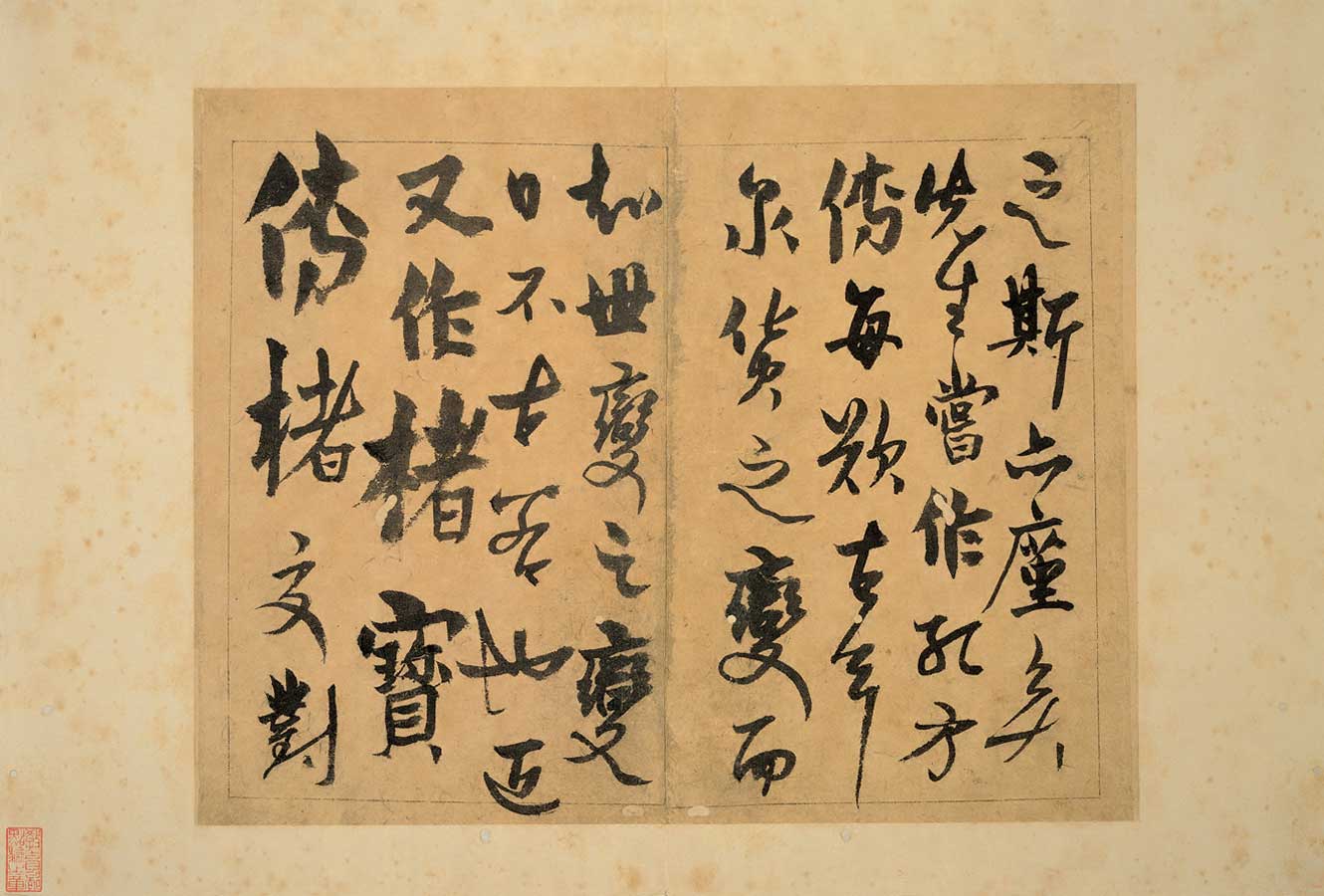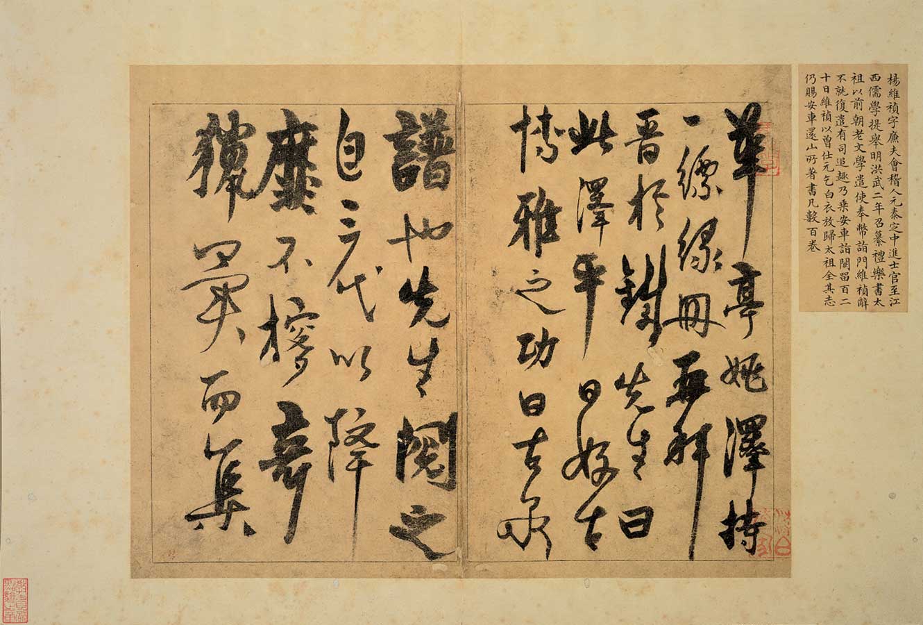 本幅草书题松江姚氏所藏古泉谱册,為元明人题钱谱杂文册之十。 杨书下笔,力透纸背,老辣之甚,书风狂怪清劲,与号铁崖体之放逸险绝文风相类。 此作行笔苍劲,结字奇倔,墨色乾湿燥润变化多端,為杨氏晚年精品。