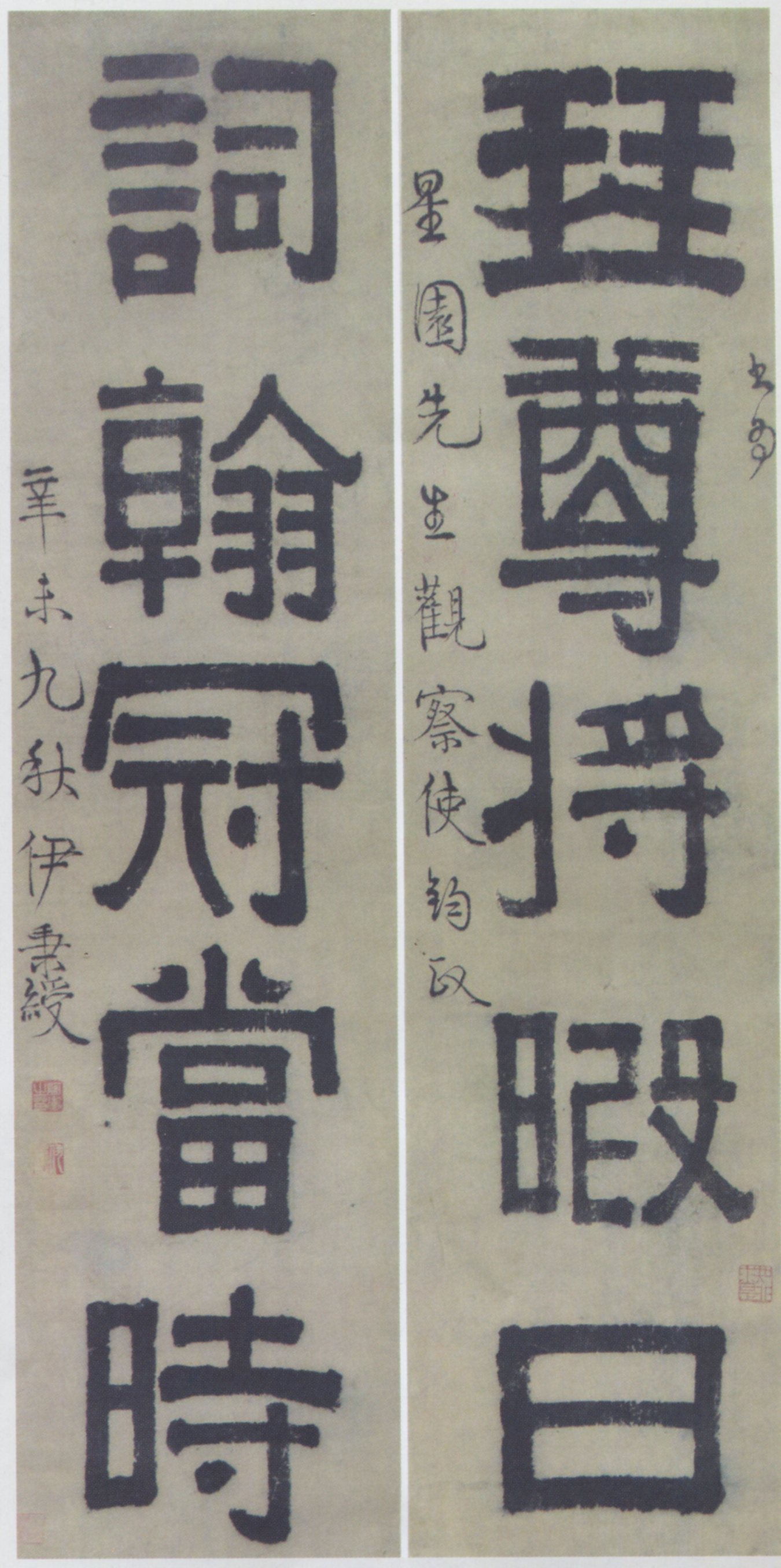 伊秉绶《隶书琴尊词翰五言联》纸本隶书 114.2×29.5cm 1811年 南京博物院藏 释文:琴尊将暇日,词翰冠当时。 款署:书为星园先生观察使钧政,辛未九秋,伊秉绶。