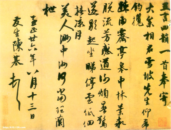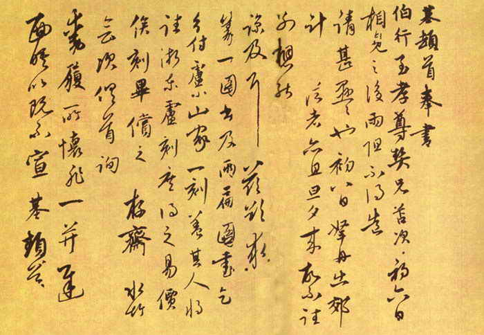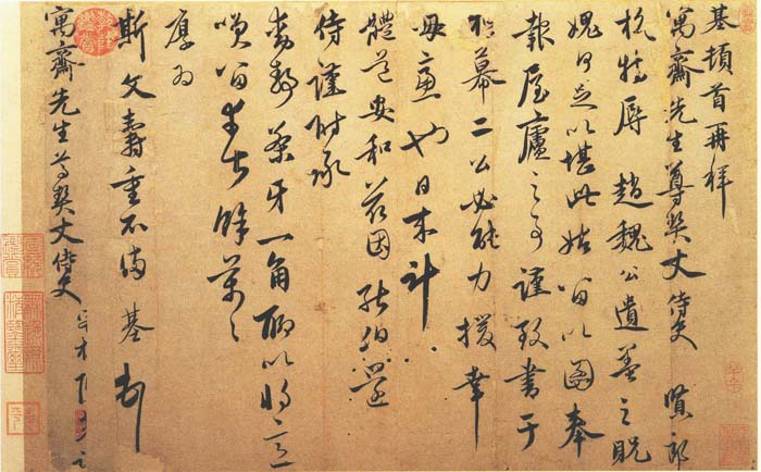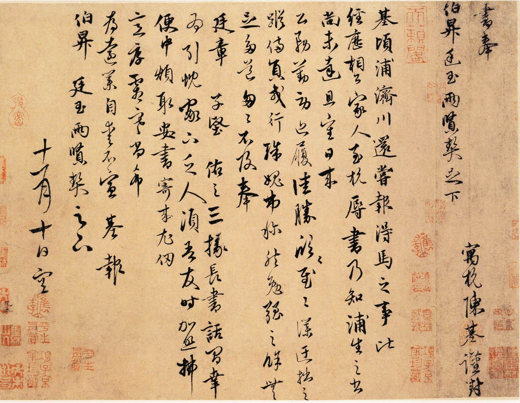 陈基《苦雨帖》,又名《致伯行契兄尺牍》,写得洒脱随意,犹如其个性。走笔驰骋操纵,情趣流走。最后“耶”字的末笔,一竖占了五六字的位置,豪气直泻无余,难得如此畅意!曾藏清内府,刻入《三希堂法帖》。