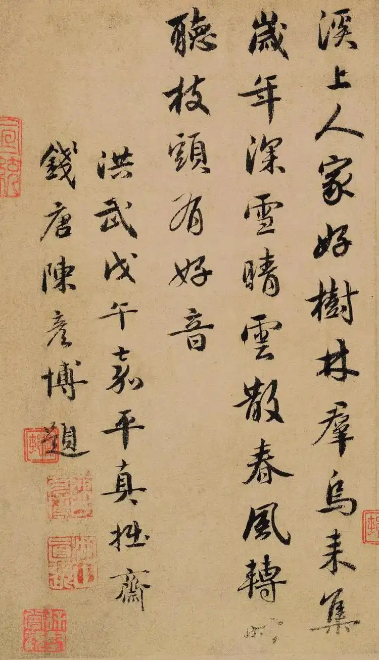 释文:溪上人家好树林,群乌来集岁年深。雪晴云散春风转,时听枝头有好音。——洪武戊午嘉平真拙斋钱唐陈彦博题。