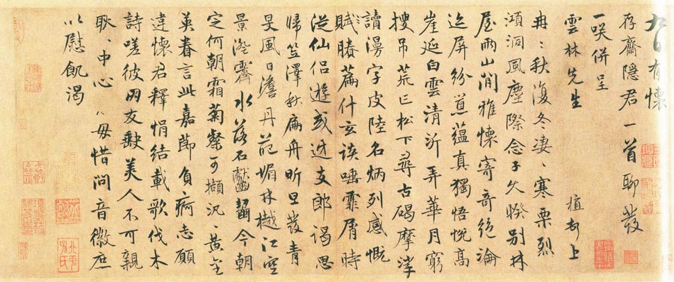 这是陈植写给"存斋隐君"的一首五言古诗,以诗代柬。"存斋"就是沈右,沈右自署"存存斋",陈基《夷白斋稿》有"存存斋记"一篇,云:"沈君仲说(沈右字仲说),隐居于吴会,耕学于笠泽,庐于陈公之原,而皆名其室曰存存斋"。此诗中亦有"思归笠泽秋"的句子,与上说正合。另外 在存世的沈右书迹中,也常提及陈植,其中"诗柬帖"即"与叔方诗札并柬"帖,就是给陈植的,可知二人交往颇密。"云林",即倪瓒,时亦在吴中。
