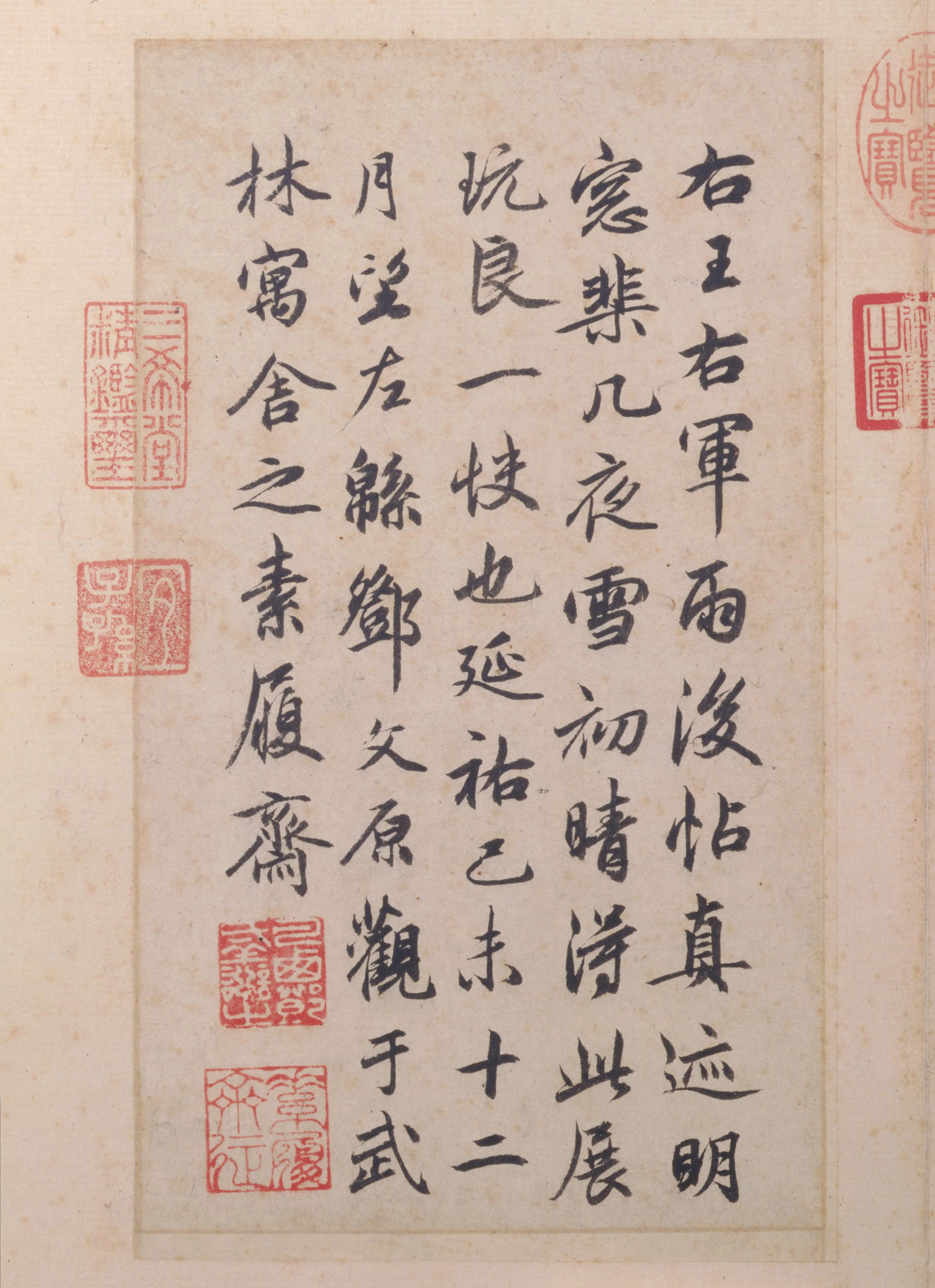 释文:右王羲之《雨后帖》真迹,明窗棐几,夜雪初晴,得此展玩,良一快也!延祐己未十二月望,左绵邓文原观于武林寓舍之素履斋。
