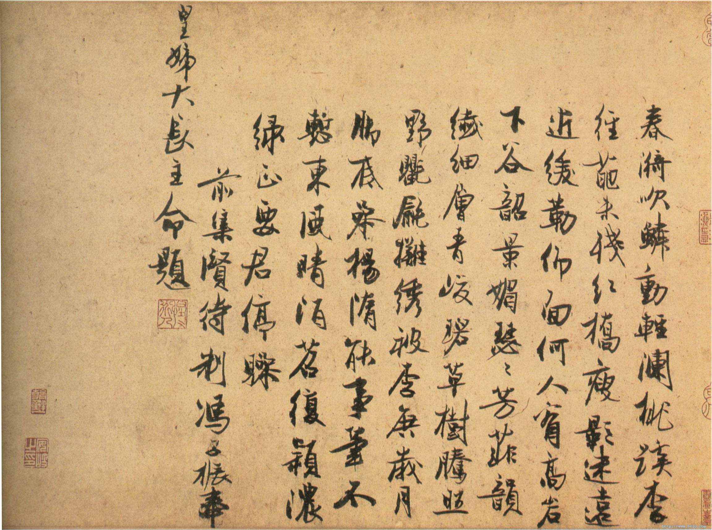 据载,冯子振与僧人交往颇密,并深通佛学。他作品中那种萧散简淡的笔致,也许即来源于禅悟。这幅《题展子虔游春图》的末款,署有“皇姊大长公主命题”一行。皇姊本名 “祥哥拉吉”,元顺宗之女,元武宗、仁宗都是她的兄弟。她也是元代著名的宗室女收藏家,眼界很高,收藏的画上曾多次请冯子振题跋,《题展子虔游春图》便是这些题跋中突出的一幅,尽管冯子振在元代、在历史上书名不彰,但从这些题跋来看,潇洒自如,其水平决不亚于当时受到赵孟頫影响的元代其他书家。由此可见,冯的书法在当时的声名也是很高的。