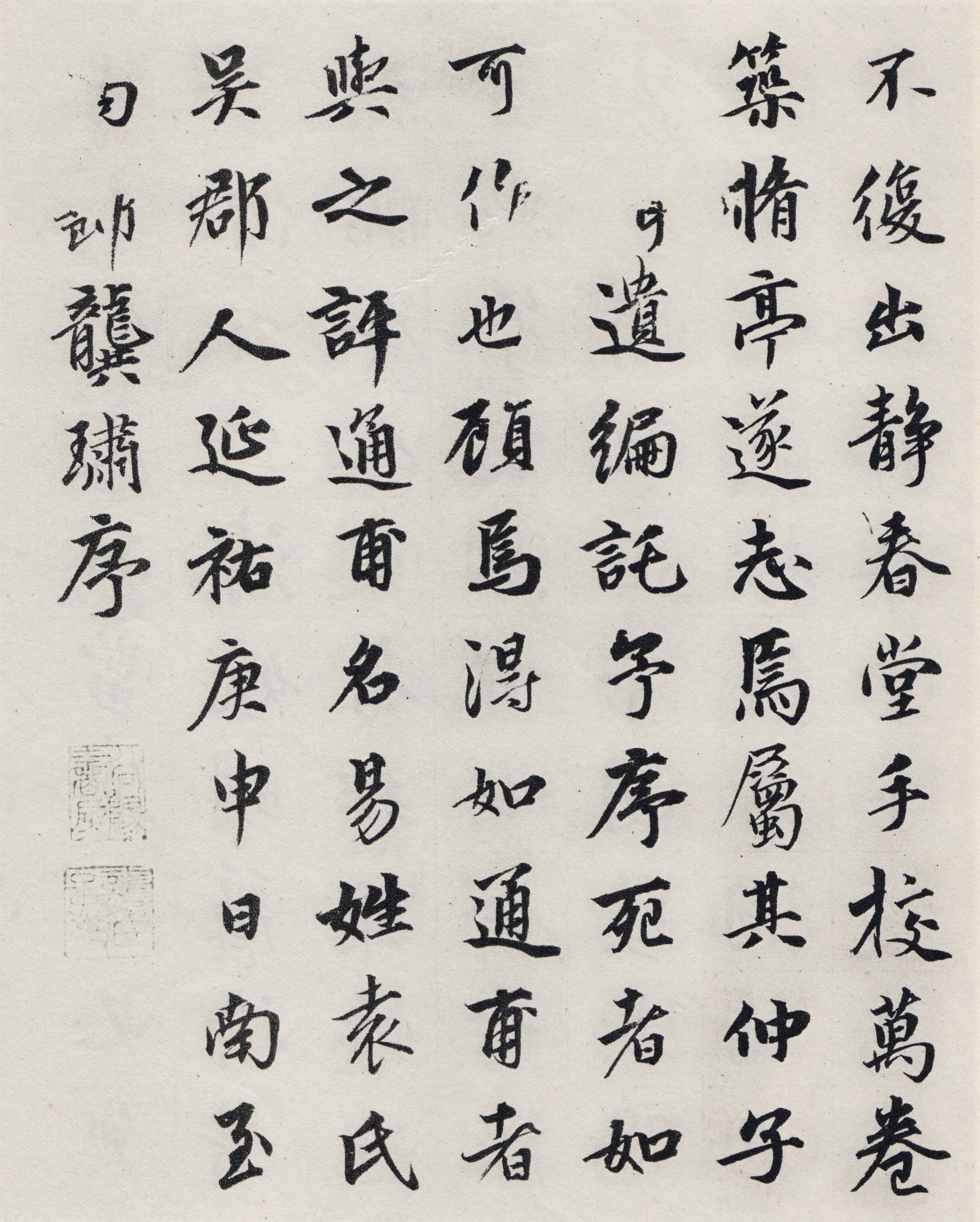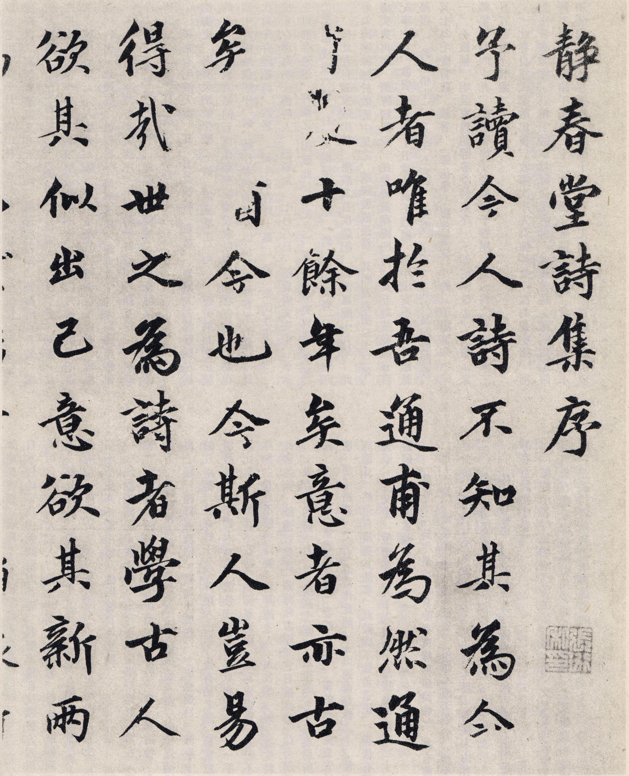 此卷包括元人龚璛、陆文圭、杨载、汤弥昌、陈绎曾所书《静春堂诗集》序,虞集、郭麟孙跋,钱重鼎诗,卷末附黄溍撰《故静春先生袁君墓志铭》。《静春堂诗集》作者袁易生于南宋景定四年(1263年)。《静春堂诗集》为袁易次子袁仲长裒辑其父遗稿而成,并请其父的知交们题序。龚璛书《静春堂诗序》划以界格,用于碑刻,故书写端庄凝重,体态严整方阔,为刻意精心之作。年款“延祐庚申”为元延祐七年(1320年),龚璛时年55岁。 (撰稿人:傅红展)
