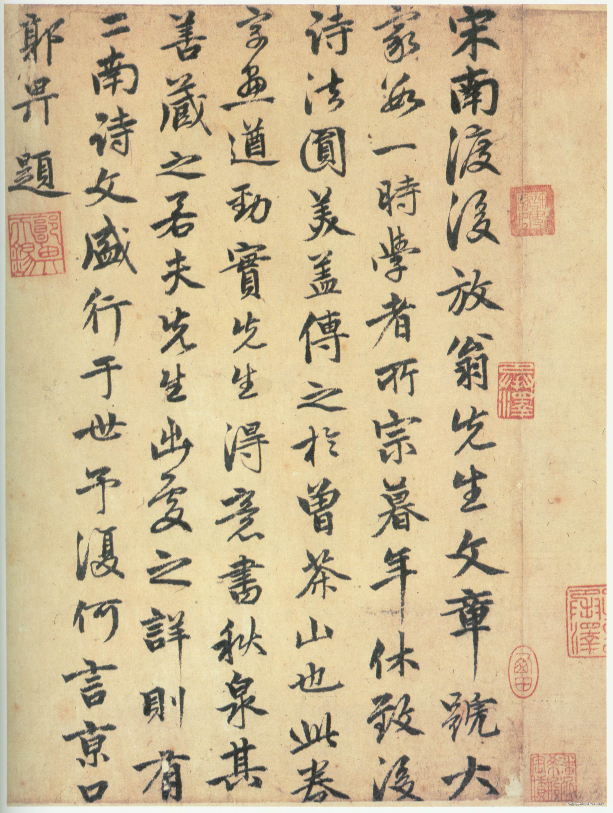 郭畀《跋陆游自书诗卷》,行书。《自书诗卷》为陆游告退归里时所作,曾一度在镇江流传,当时的郭畀在镇江见到这幅珍迹后,仰慕陆游的诗名,为之题跋。此幅书法行笔端秀多姿,又时见锋芒,虽近于赵孟頫而少其圆润,点画间类宋人风格。