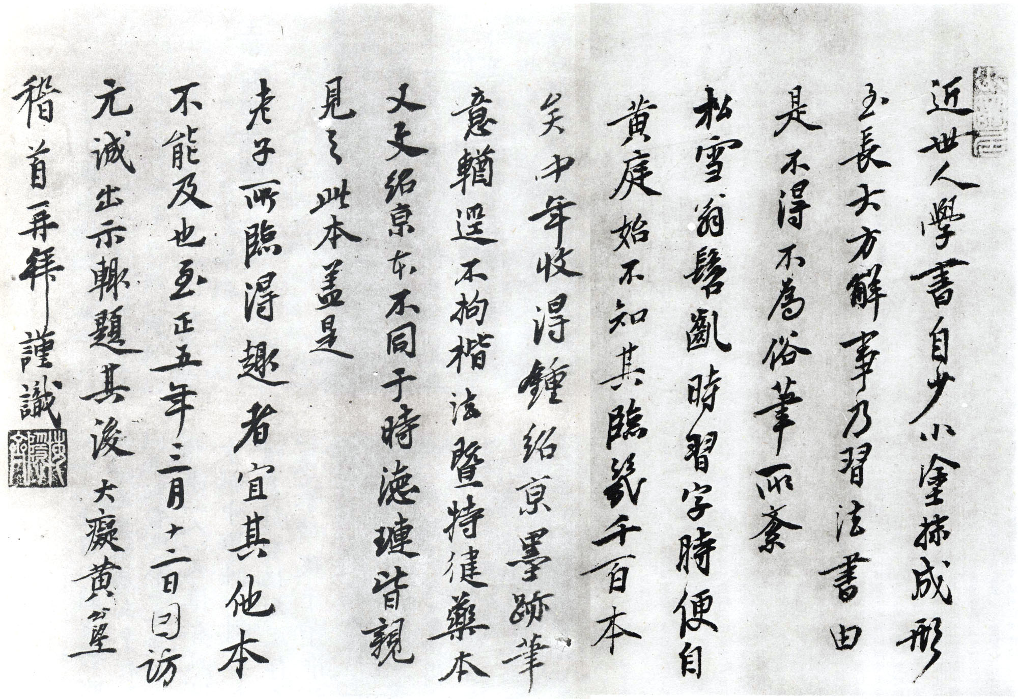 释文:近世人学书,自少小涂抹成形,至长大方解事,乃习书法,由是不得不为俗笔所紊,雪松翁髫龀时习字时,便自黄庭始,不知其临几千百本矣。中年收得钟绍京墨迹,笔意道劲,不拘楷法……