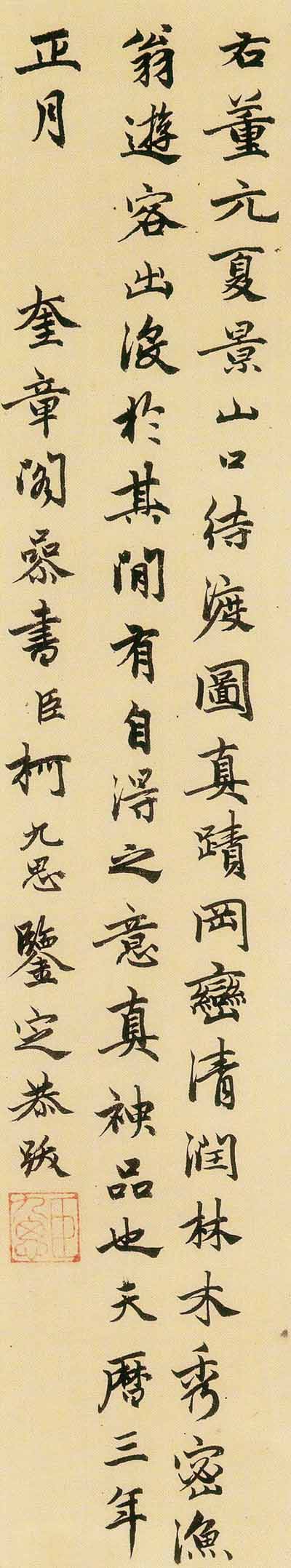 释文: 右董元夏景山口待渡图真迹,冈峦清润,林木秀润,渔翁游客出 没于其间,有自得之意。真神品也。天历三年正月 奎章阁参书臣柯九思鉴定恭跋。