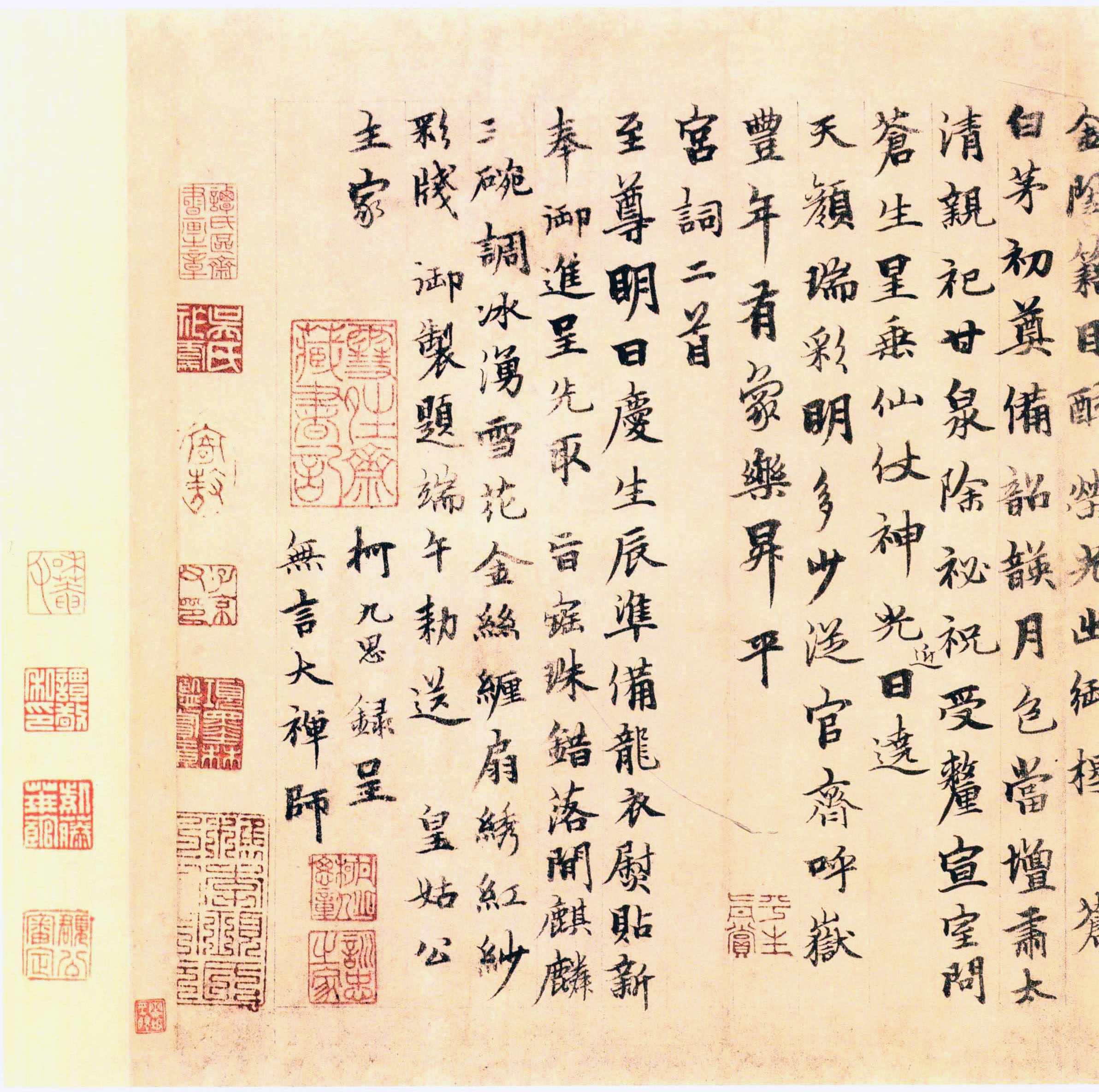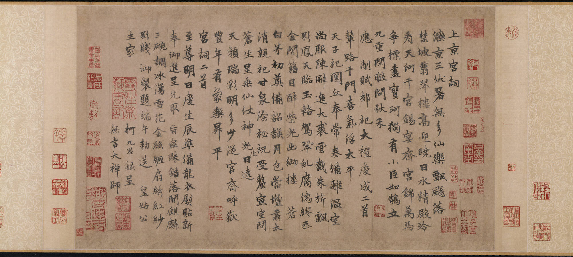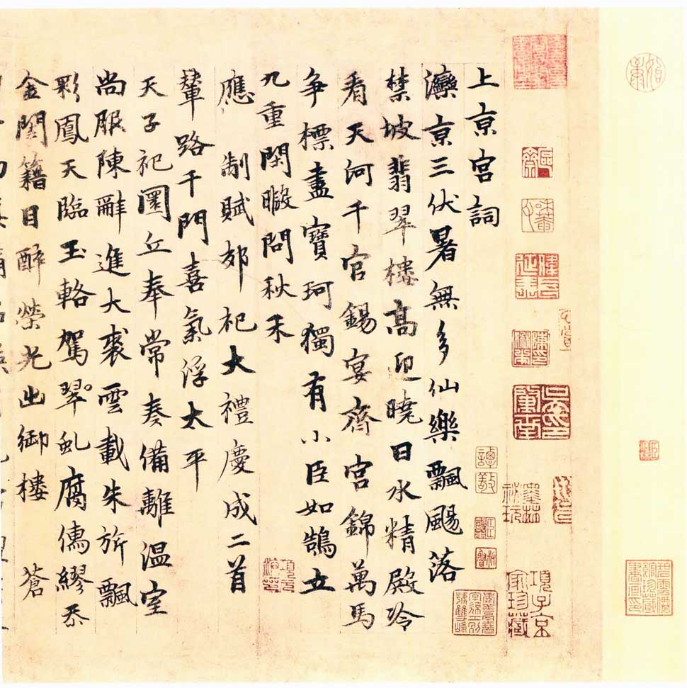 《上京宫词》卷,纵30.9厘米,横53厘米,现已流至海外,藏美国普林斯顿大学美术馆。前人早已指出宋以后没有严格意义上的楷书,此卷虽也时有行书意态,但仍可算为楷书。