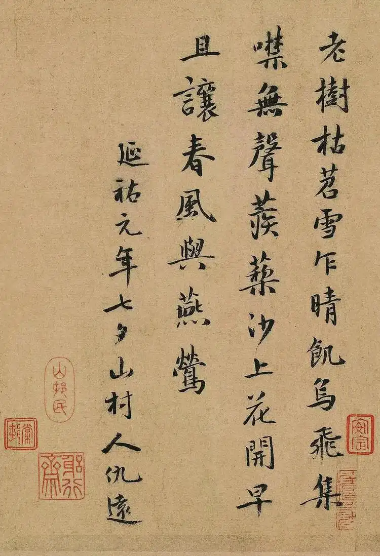 释文:老树枯苕雪乍晴,饥乌飞集噤无声。蒺藜沙上花开早,且让春风与燕莺。——延祐元年七夕山村人仇远。