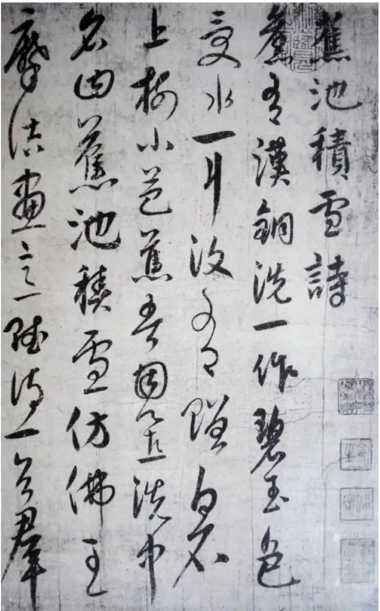 《蕉池积雪诗》书于至正庚子(1360)七月十日,正其晚年所书,通幅手卷 一气贯注,十分流畅,点画圆融浑劲,气清质实,于姿媚中吐风神,其实草书不难于使转,而难在于使转中见点画;不难于错落,而难在于错落中见自然,细观此册 作品 ,用笔简练很少有牵丝、游丝给人以眼花缭乱之感,但字与字之间,形不贯而气贯,其中写到神融气畅之时,四五字一笔环转而下,纵心奔放,给人以大气磅礴之感,且其点画于痛快淋漓之中有沉着精到之能,无一懈笔,可见作者精熟于草法,深得怀素、大令之妙,正如李日华《六研斋笔记》所评“介书圆劲畅朗,神追大令”。