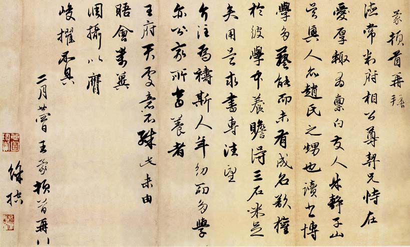 王蒙书学赵孟頫,学得极像,王蒙深受其书风影响。从此帖可以看出,不仅点画转折,有赵书规模,就是笔画结体,也学得极似,而且是笔圆墨润,笔画清轻,颇有姿致。此札若置之赵孟頫帖中,恐不能立辨。