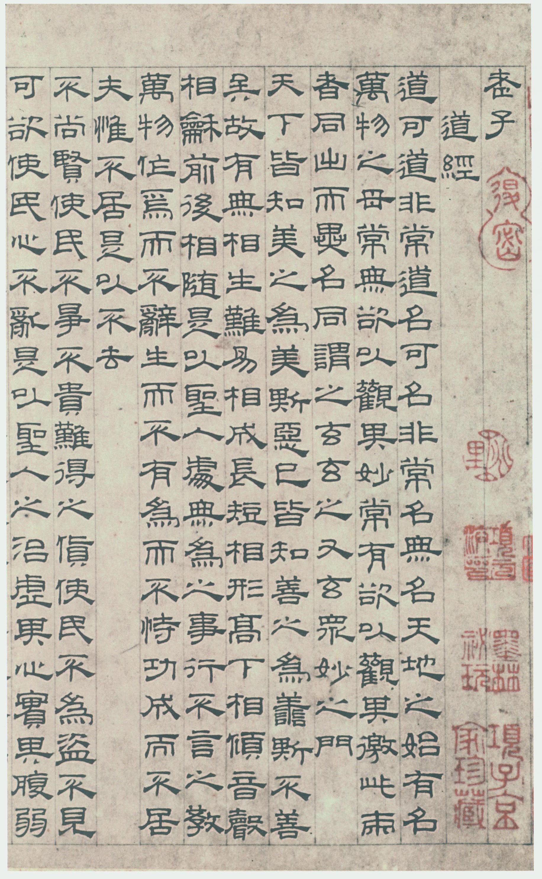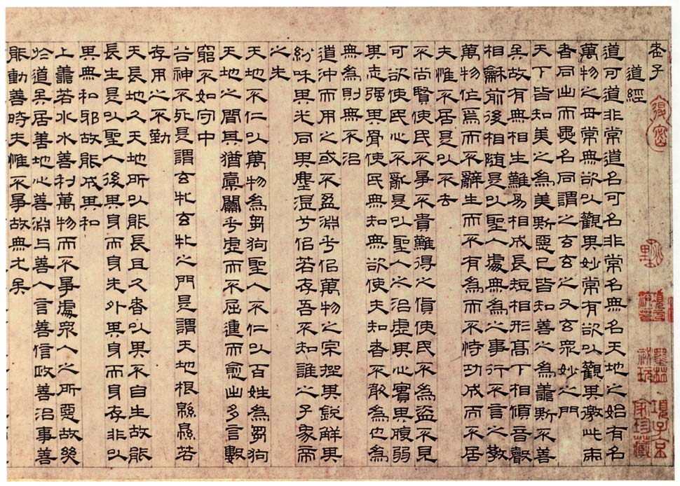 此卷《道德经》前附有白描《老子授经图》及清乾隆、嘉庆、宣统内府诸收藏印。图左下角落元盛懋款,说明此卷当时以画而收藏,但经考证此款系后添,非盛氏手笔,而在后纸胡子昂题跋中也未提及此图,只论吴叡书法,可见此经卷应为吴叡隶书之佳作。