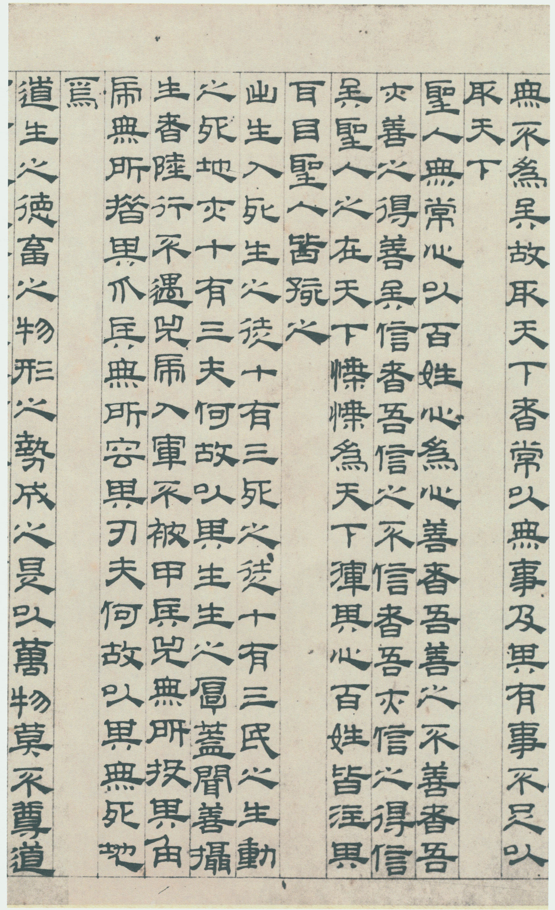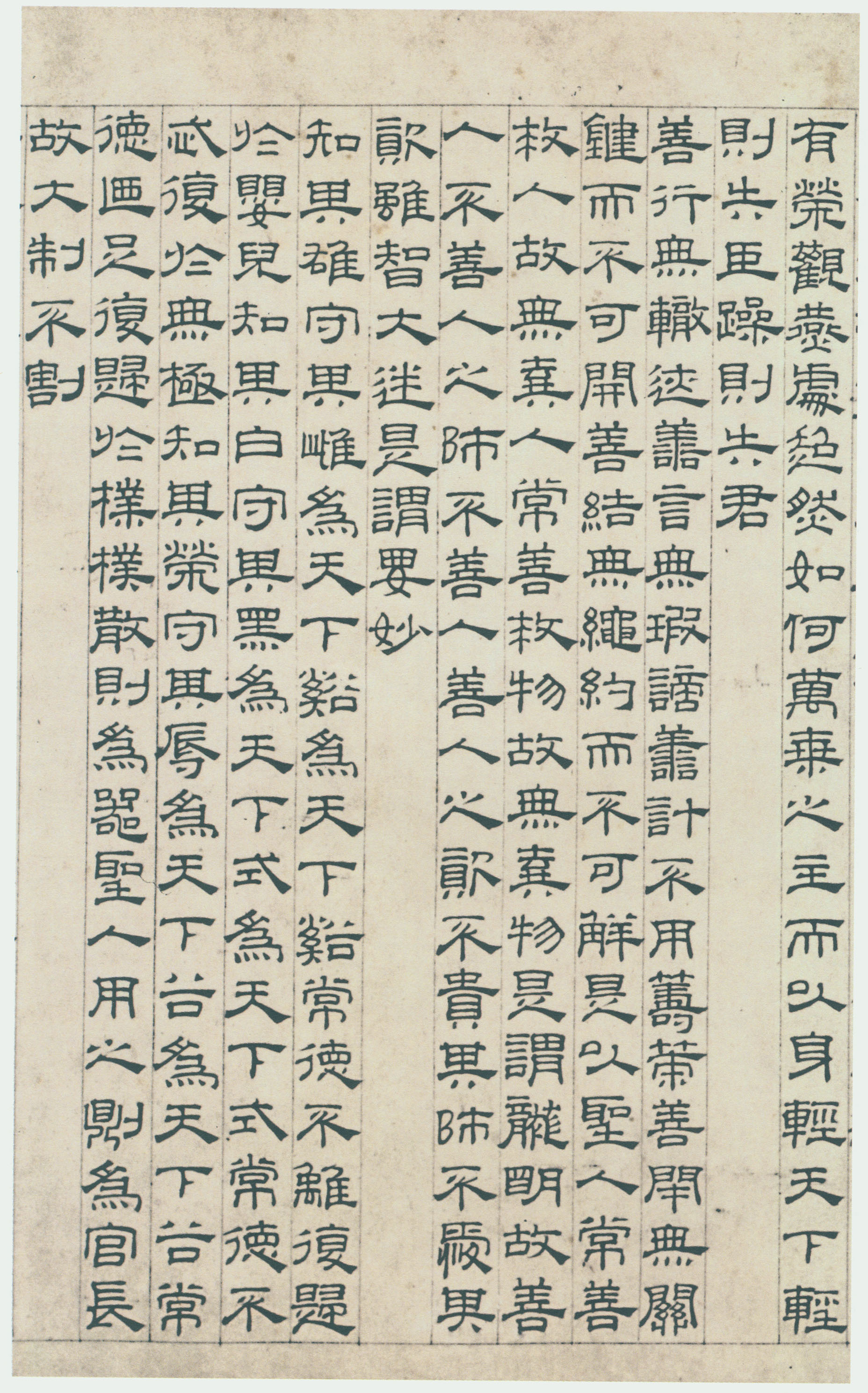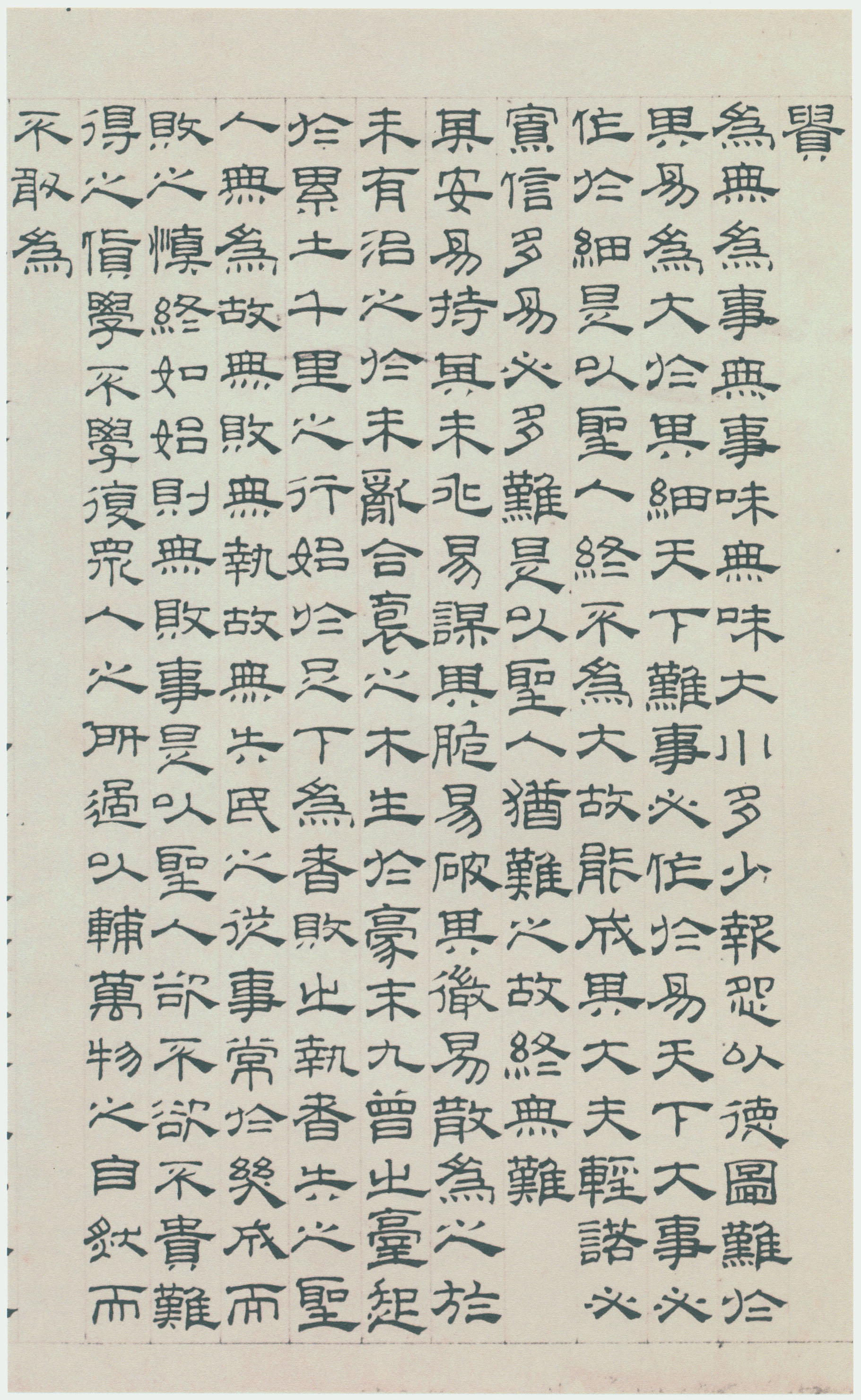 此帖为吴叡三十八岁时所书,笔法方圆互见,结体整齐划一,虽有汉隶风规,而实依唐人笔意。通篇用笔工稳精谨,五千言文字一气呵成,且无一懈笔,功力深厚。