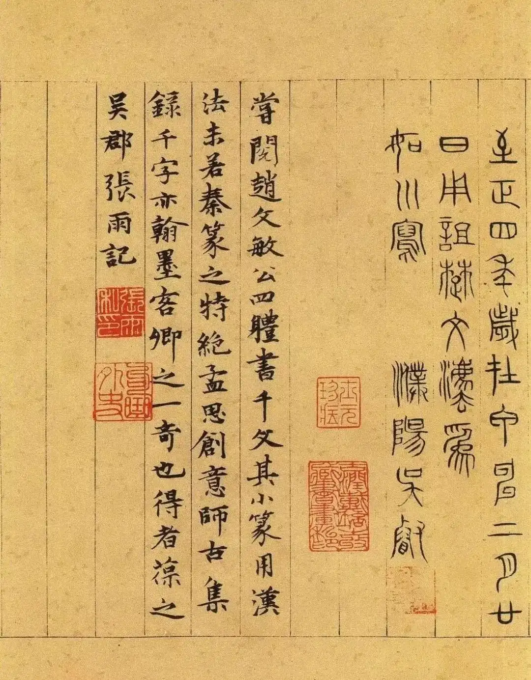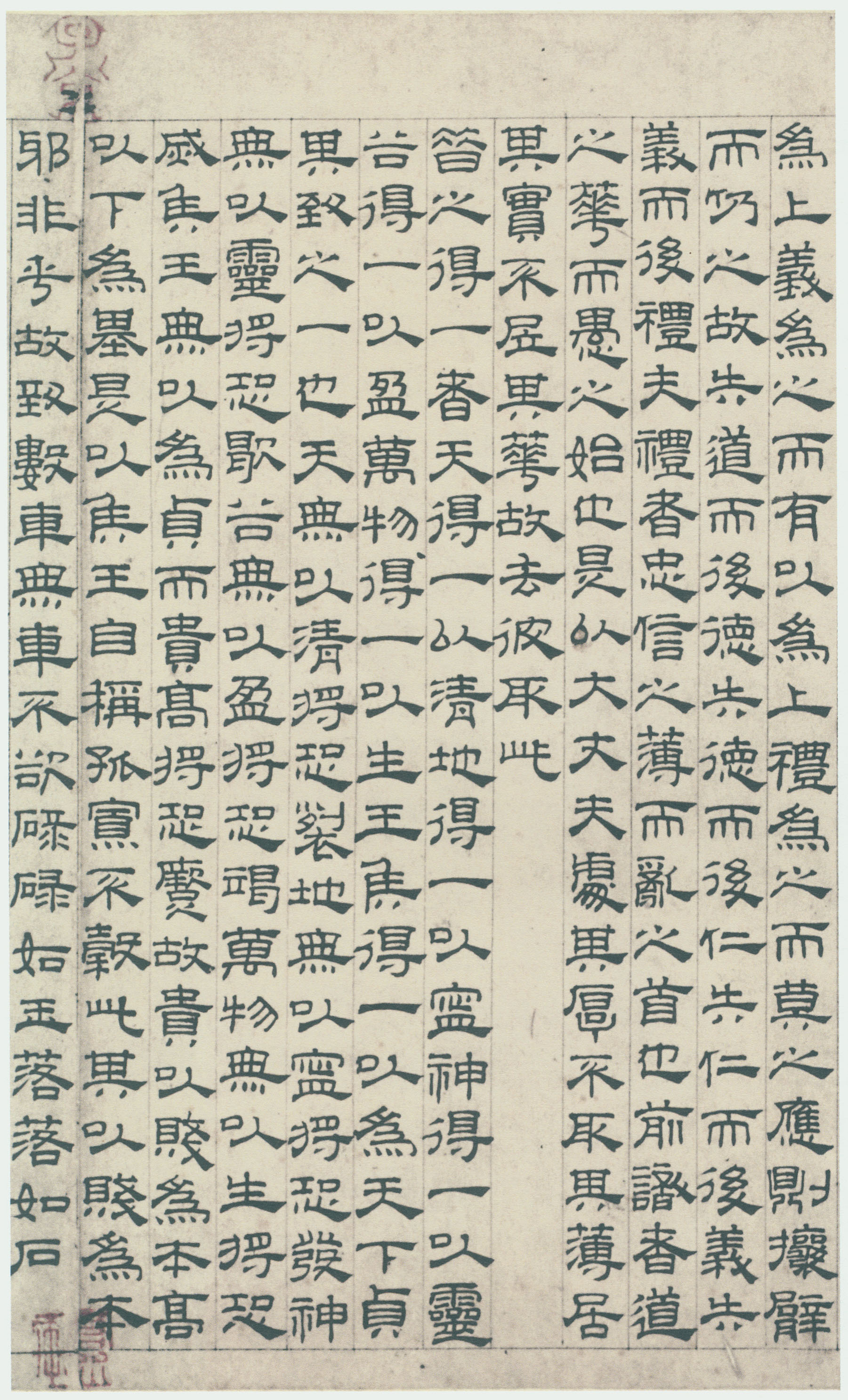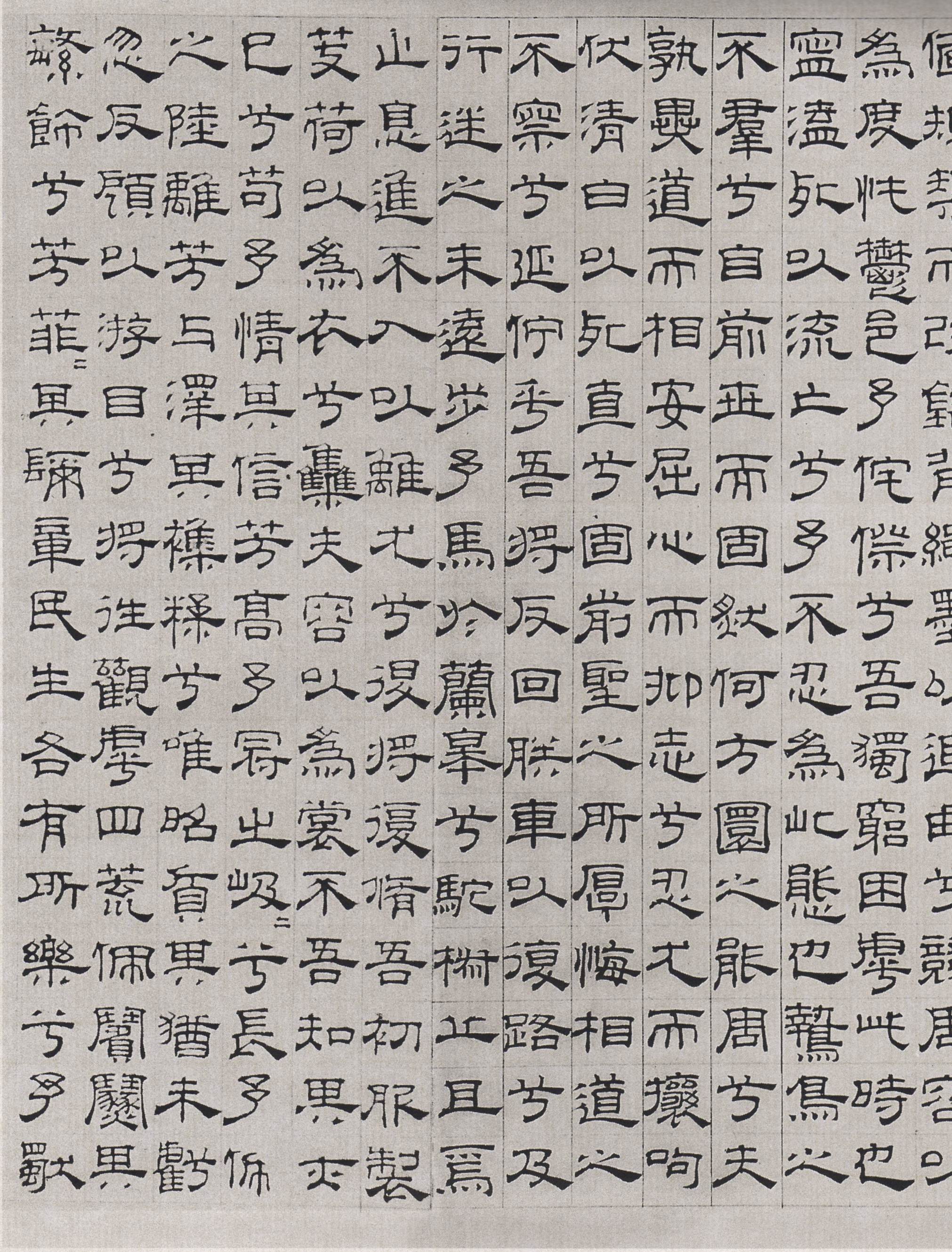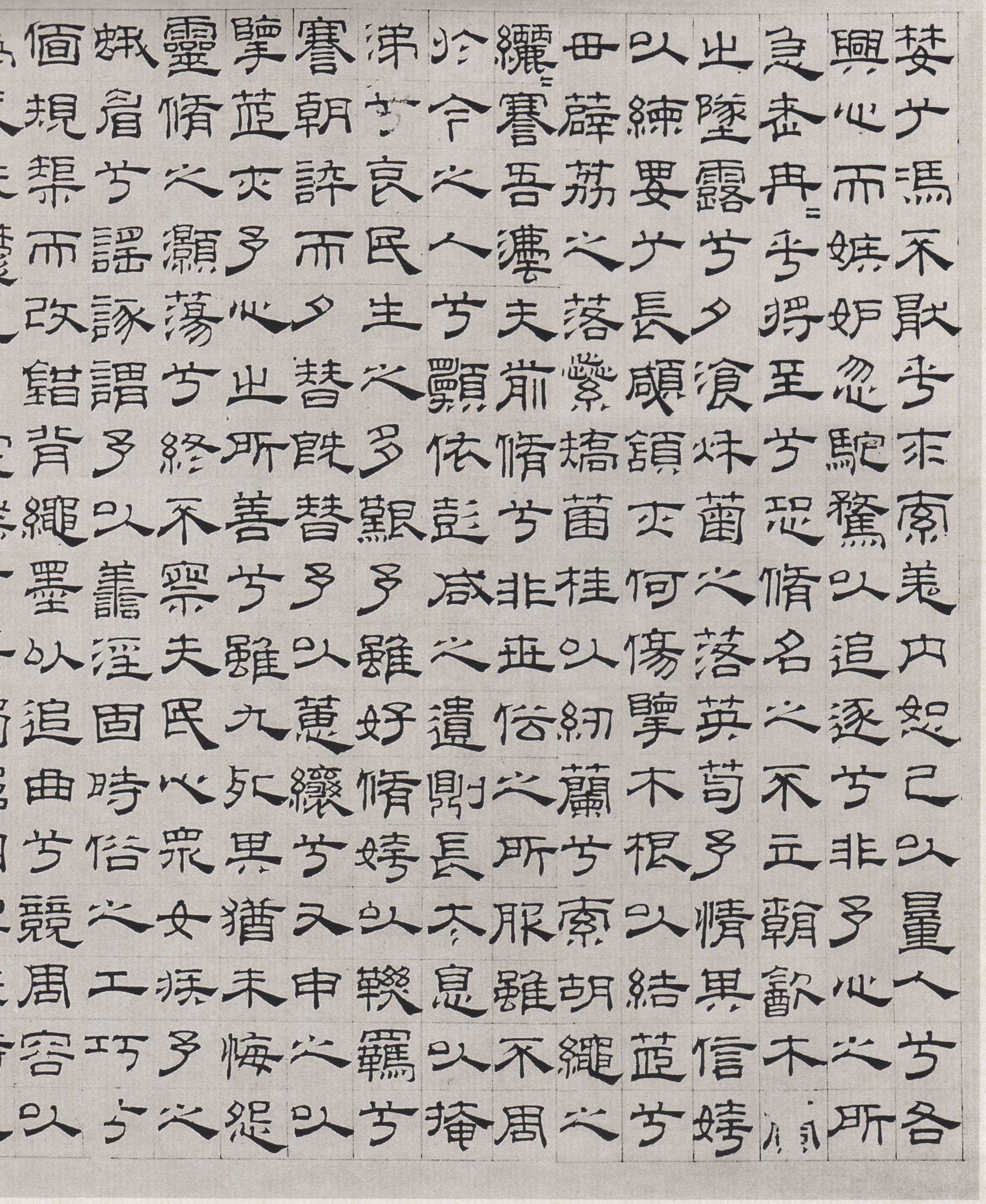 此帖为吴叡三十八岁时所书,笔法方圆互见,结体整齐划一,虽有汉隶风规,而实依唐人笔意。通篇用笔工稳精谨,五千言文字一气呵成,且无一懈笔,功力深厚。