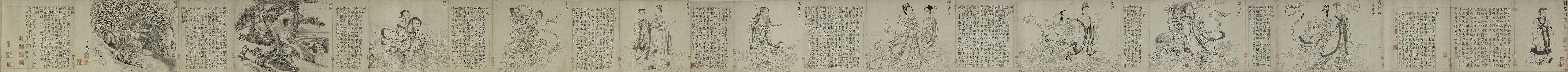 此为元代张渥临李公麟九歌图卷。张渥(?-约1356),字叔厚,号贞期生,祖籍淮南,居杭州。擅长白描人物。白描《九歌图》长卷画凡十一段,每段有题辞,为吴叡(1298-1355)至正六年(1346)篆书。