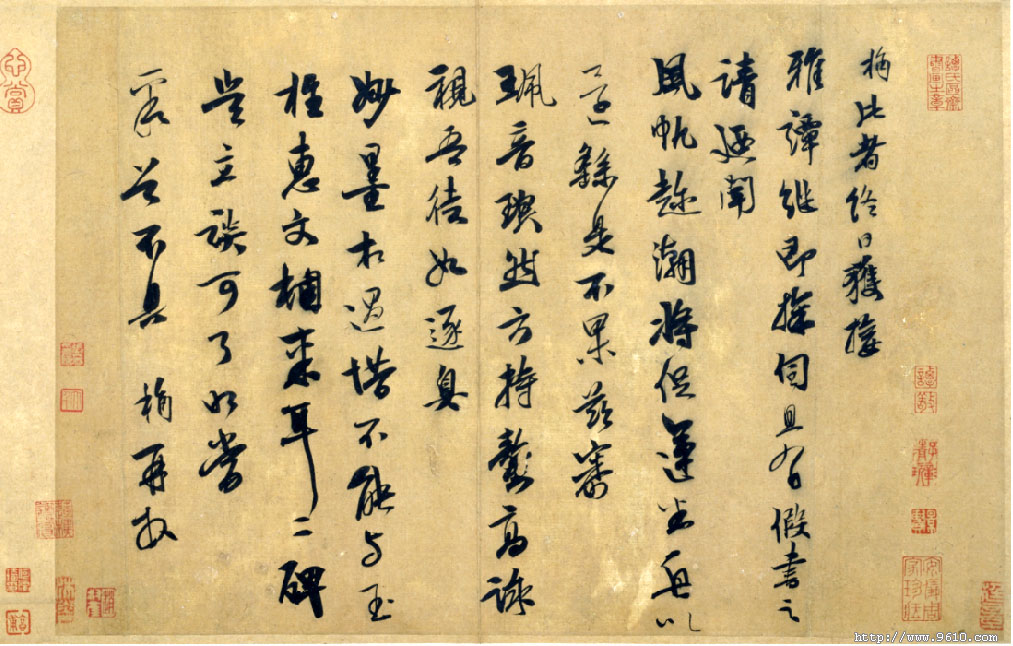 释文: 附录:师古图新话袁桷 袁桷(1266~1327年),字伯长,号清容居士,又号见一居士,鄞县人。卒谥文清。元大德初年(1297年),被举荐担任翰林国史院检阅官、翰林直学士、知制诰同修国史。后又拜侍讲学士。奉旨修成宗、武宗、仁宗三朝大典,元英宗对袁桷的博学十分赏识,又命他撰述宋、辽、金史,后因朝廷发生变故而中断。袁桷始从戴表元学,后师事鄞县王应麟,遂以能文名。泰定初年(1324年),袁桷辞官归故里,著有《五朝实录》、《仁宗实录》、《读书记》、《四明高僧传》、《延祐四明志》、《四明高僧诗》等。喜蓄典籍,承曾祖袁韶之业,搜书万卷,藏书富于浙东。卒后,家人保管不当,毁者过半。 赵孟頫在元代高举复古主义大旗,赵氏书风在元代大行其道,追随者蔚然成风。袁桷是赵孟頫的表弟,自然有亲见赵孟頫作书的机会,赵孟頫的书学思想、审美旨趣,无疑会对其产生影响,从袁桷的作品中就明显地感受到一股浓郁的晋唐气息。分析袁桷的作品,会发现同样是学晋、唐书风,袁桷的作品中明显地流露出与同时代书家不同的味道,尤其与赵孟頫展现出了异样的面貌。陶宗仪《书史会要》云:“袁桷书从晋、唐中来,而自成一家。”李日华说:“袁清容书,快利沉着,亦是诚悬儿孙。”指袁桷书法受柳公权影响甚多。 袁桷的《雅谭帖》,除了以晋、唐为根基外,更多的是米芾书法对他的滋养。在赵孟頫书风笼罩的元代书坛,直接取法宋人,学习米芾且学得如此地道的书家已不多见,袁桷可谓其中的佼佼者。袁桷在许多题跋中显示了他对米芾书法的独到见解与肯定,如《跋米元章书》中云:“元章壮年学萧诚书,后学段季展,最后悉意师褚河南,其体三变,晚复规模大令,往往行书为长。”又云:“草书之变始张旭,行书之变由米老。”特别是对于米芾临古功力之深,袁桷心悦诚服。《雅谭帖》通篇以行书为主,夹杂少许草字,帖中“运、審、能、来”等字明显有米芾的影子,深得米芾“风樯阵马,沉着痛快”之旨。用笔八面出锋,线条质量极高,一些纤细的笔画也显示出完美的质感。字形结构似斜反正,恣意错落,既有米字的欹侧,又有王字的飘逸。通篇神采奕奕,精神飞动,笔意洞达,颇有生气,显示了深厚的学古功力与过人技巧。透过《雅谭帖》,我们能够学到一种严谨认真的态度。学书要想超越古人,必先做到无限的接近古人。袁桷是元代重要的鉴藏家,他鉴定、题跋过许多晋、唐、宋、元名迹,其中赵孟頫的绘画最多,这些真知灼见都是他艺术审美的直观感受,读来令人受益良多。 |