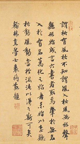 袁桷(1266—1327) 字伯长,浙江鄞县人。 系元代著名作家。生下七日,母亲亡故,靠外祖父抚养成人。袁桷小时读书,勤奋苦学,每每通宵达旦。他见宋末文学杂乱,很少建树,便以重振文坛自任。元大德初年(公元1297年),被荐举担任翰林国史院检阅官、翰林直学士、知制诰、同修国史。后又拜侍讲学士。他奉旨修成宗、武宗、仁宗三朝大典,增添了许多治国安邦的道理。元英宗对袁桷的博学十分赏识,又命他撰述宋、辽、金史,袁桷亦奋然自任。以后由于朝廷发生变故而没有完成。泰定初年(公元1324年),袁桷辞职回归故里,闭门读书,自号“清容居士”。 在朝20余年,朝廷制册、勋臣碑铭,多出其手。文章博硕,诗亦俊逸。又工书法,存世书迹有存世书迹有《雅潭帖》、《和一庵诗帖》、《同日分涂帖》、《旧岁北归帖》等。对音乐亦有造诣,著有《琴述》。卒赠中奉大夫、江浙中书省参政,封陈留郡公,谥文清。另著有《易说》、《春秋说》、《清容居士集》、《延祐四明志》等10余种。《延祐四明志》考核精审,为宋元四明六志之一。 袁桷的书法深受赵孟頫的学古法思想影响,从晋、唐中来,尤得力于柳公权、米芾,遒媚劲健,顿挫分明。 袁桷《跋黄庭坚松风阁诗帖》行书,台北故宫博物院藏。 |