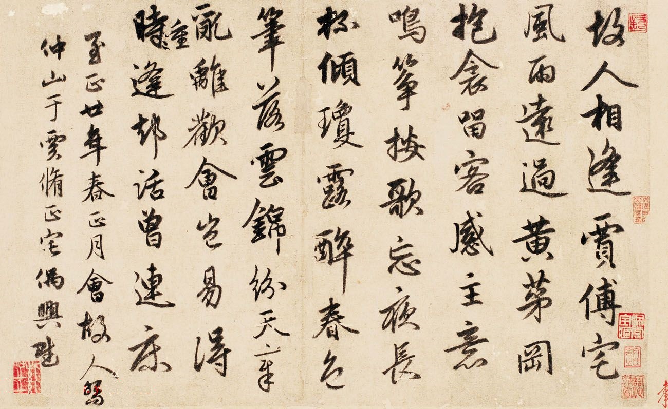 释文:故人相逢贾傅宅,风雨远过黄茅冈。抱衾留客感主意,鸣筝按歌忘夜长。杯倾琼露醉春色,笔落云锦纷天章。乱离欢会岂易得,重逢却话曾连床。 至正廿年春正月,会故人乔仲山于云修正宅,偶兴赋此。