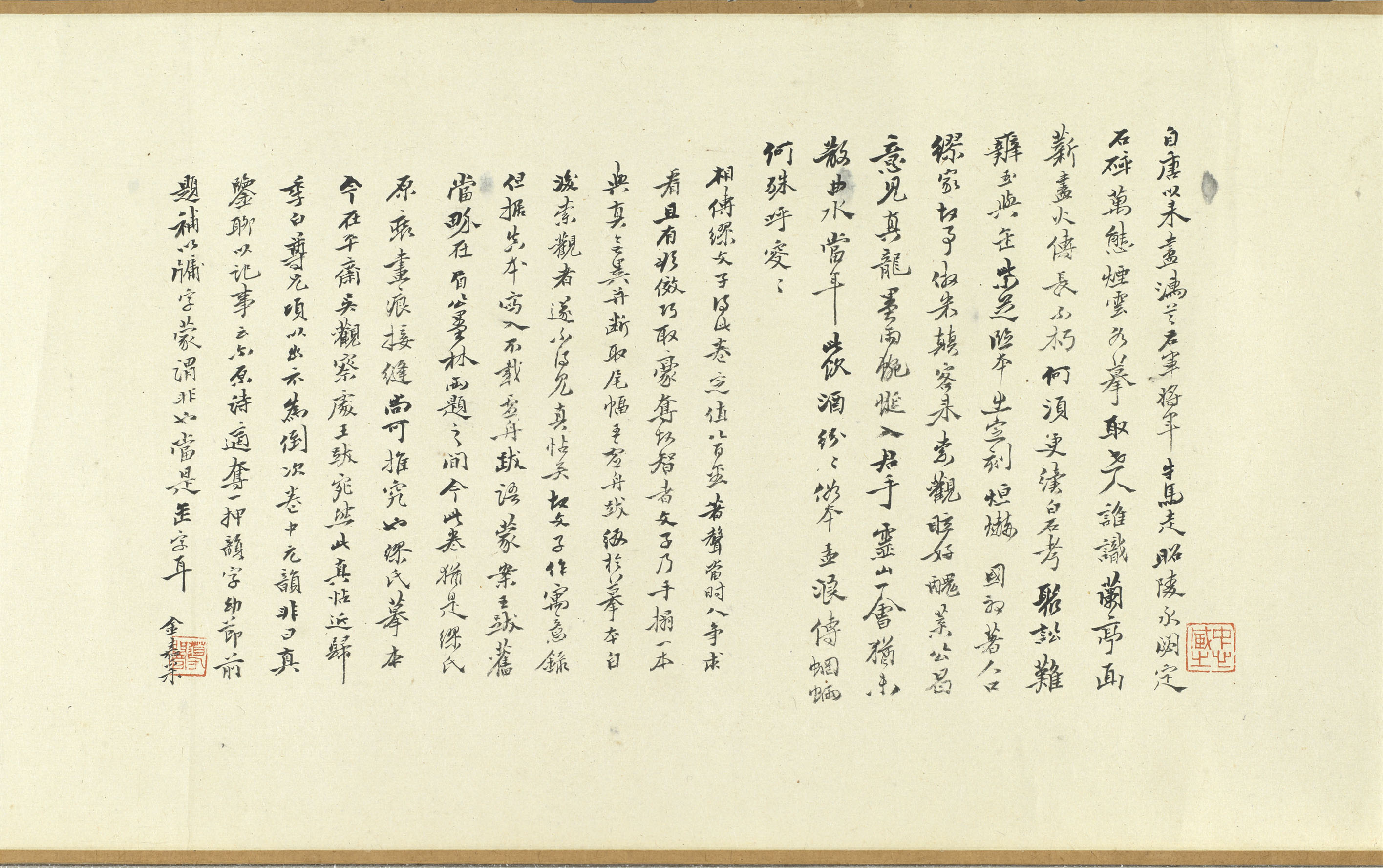 自唐以来尽濡首。右军将军牛马走。昭陵承閟定石碎。万态烟雲各摹取。世人谁识兰亭画。薪尽火传长不朽。何须更续白石考。聚讼难辨玉与缶。紫芝临本出定刻。烜爀国初著人口。繆家故事倣米顚。客来索观眩好丑。叶公曷意见眞龙。墨雨蜿蜓入君手。灵山一会犹未散。曲水当年此饮酒。纷纷俗本孟浪传。蝄蜽何殊呼叟叟。相传繆文子得此卷。定值八百金。著声当时。人争求看。且有欲傚巧取豪夺故智者。文子乃手搨一本。与眞无异。并断取尾幅王虚舟跋。缀於摹本。自后索观者遂不得见真帖矣。故文子作寓意录。但据真本写入。不载虚舟跋语。蒙案王跋旧当界在眉公墨林两题之间。今此卷犹是繆氏原装。画痕接缝尚可推究也。繆氏摹本今在平斋吴观察处。王跋宛然。此真帖近归季白尊兄。顷以出示。為倒次卷中元韵。非曰真鉴。聊以记事云尔。原诗适夺一押韵字。幼节前题补以牖字。蒙谓非也。当是缶字耳。金嘉采。