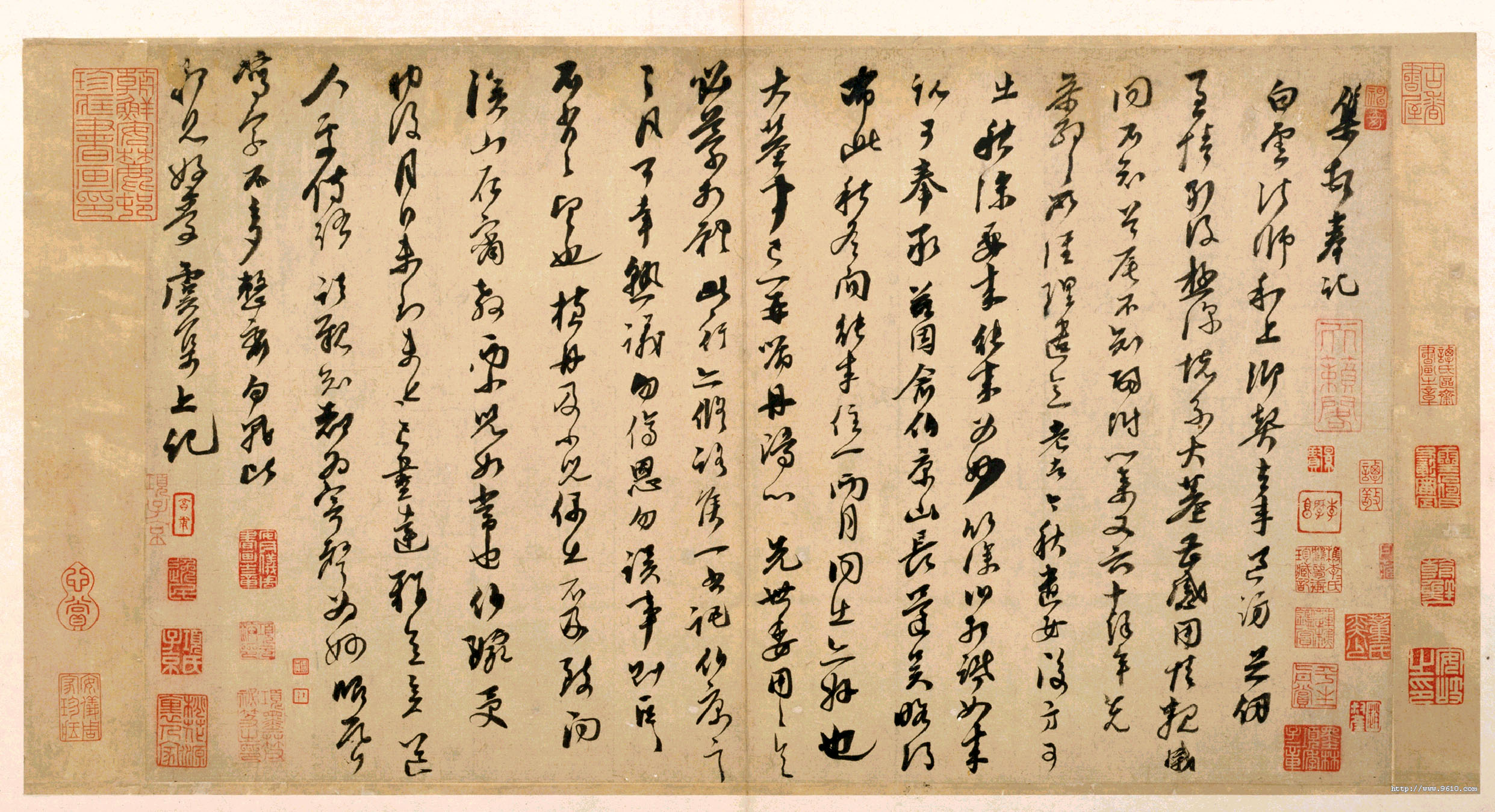鉴藏印有项元汴诸印,“董奕少氏”、“李肇亨”、“桃花源里人家”及安岐、完颜景贤、何子彰、赵叔彦、张爰、谭敬诸印28方,半印2方。