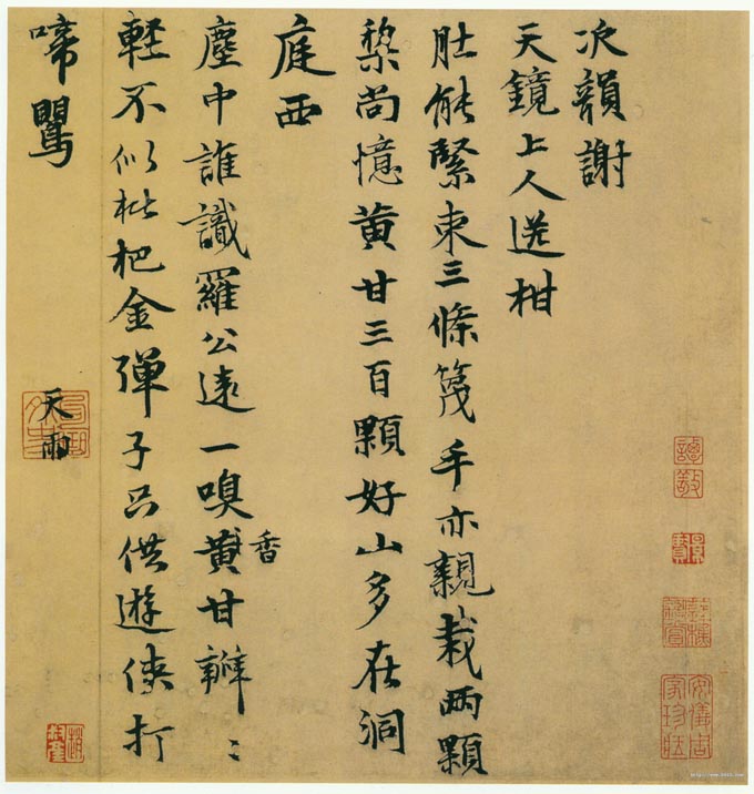 书录“次韵谢天镜上人送柑"诗。 “天镜上人”,是杭州灵隐寺僧圆瀞。此帖结体精紧确有欧书的规模,但是弃其险劲而师法赵书的清和闲雅,风格又有李邕书的刚劲峻拔,同时又得赵书的道媚俊逸。当然,张雨的识见才学和修养,使他的字并不为一家所囿,而有其本身的艺术特征,这就是结体方正,用笔精紧,戈勾特长,遒逸清新。