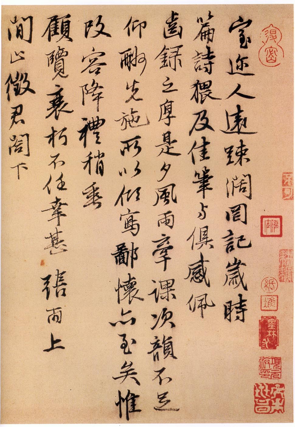 释文:室邇人遠。疎闊罔記歲時。篇詩猥及。佳筆與俱。感佩齒錄之厚。是夕風雨。牽課次韻。不足仰酬先施。所以傾寫鄙懷亦至矣。惟改容降禮。稍垂顧覽。衰朽不任幸甚。張雨上。閒止徵君閣下。烟雨湖頭暗兩峯。澹?西子若為容。平生自信千金帚。老疾難勝百罰鍾。豈有勝情如許掾。只輸豪氣與元龍。鐵心把筆猶能賦。羞比門牆桃李穠。 已丑至正九年(1349年)四月十一日夜二鼓書。