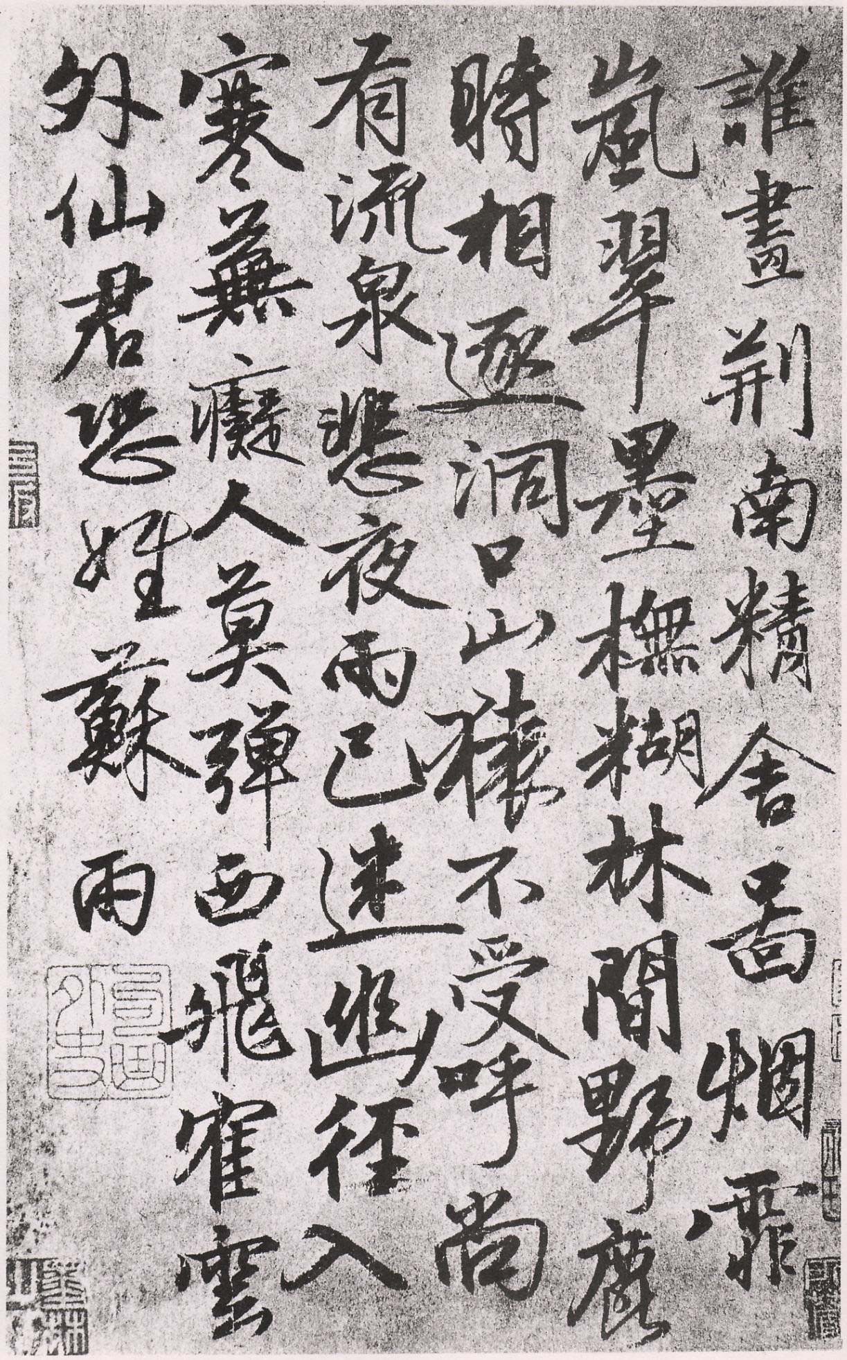 【释文】:谁画荆南精舍图。烟霏岚翠墨模糊。林间野鹿时相逐。洞口山猿不受呼。尚有流泉悲夜雨。已迷幽径入寒芜。痴人莫弹西飞鹤。云外仙君恐姓苏。雨。 资料来源:《中国书法全集》第45卷(荣宝斋)