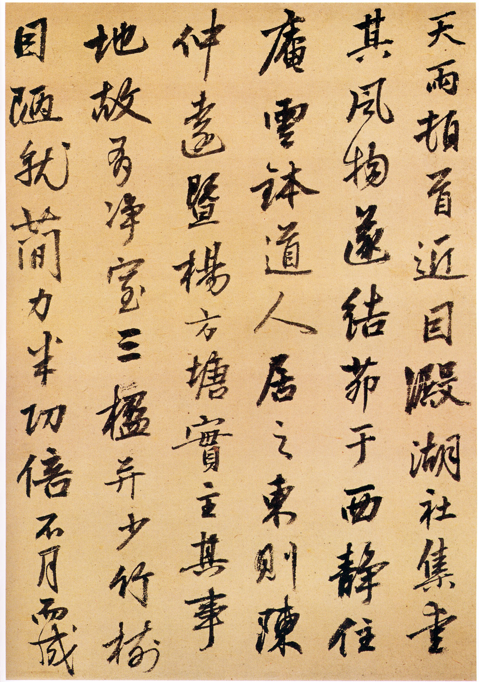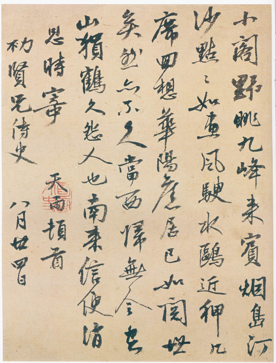 释文:天雨頓首。近因澱湖社集。愛其風物。遂結茆於西靜住庵雲鉢道人居之東。則陳仲遠暨楊方塘實主其事。地故有淨室三楹。并少竹樹。因陋就簡。力半功倍。不月而成。小閣野眺。九峯來賓。烟島汀沙。點點如畫。風(應作颿)水鷗。近狎几席。回想華陽舊居。已如閱世矣。然亦不久當西歸。無令空山鶴久怨人也。南來信便。消息時寄。天雨頓首□□賢兄侍史。八月廿四日。
