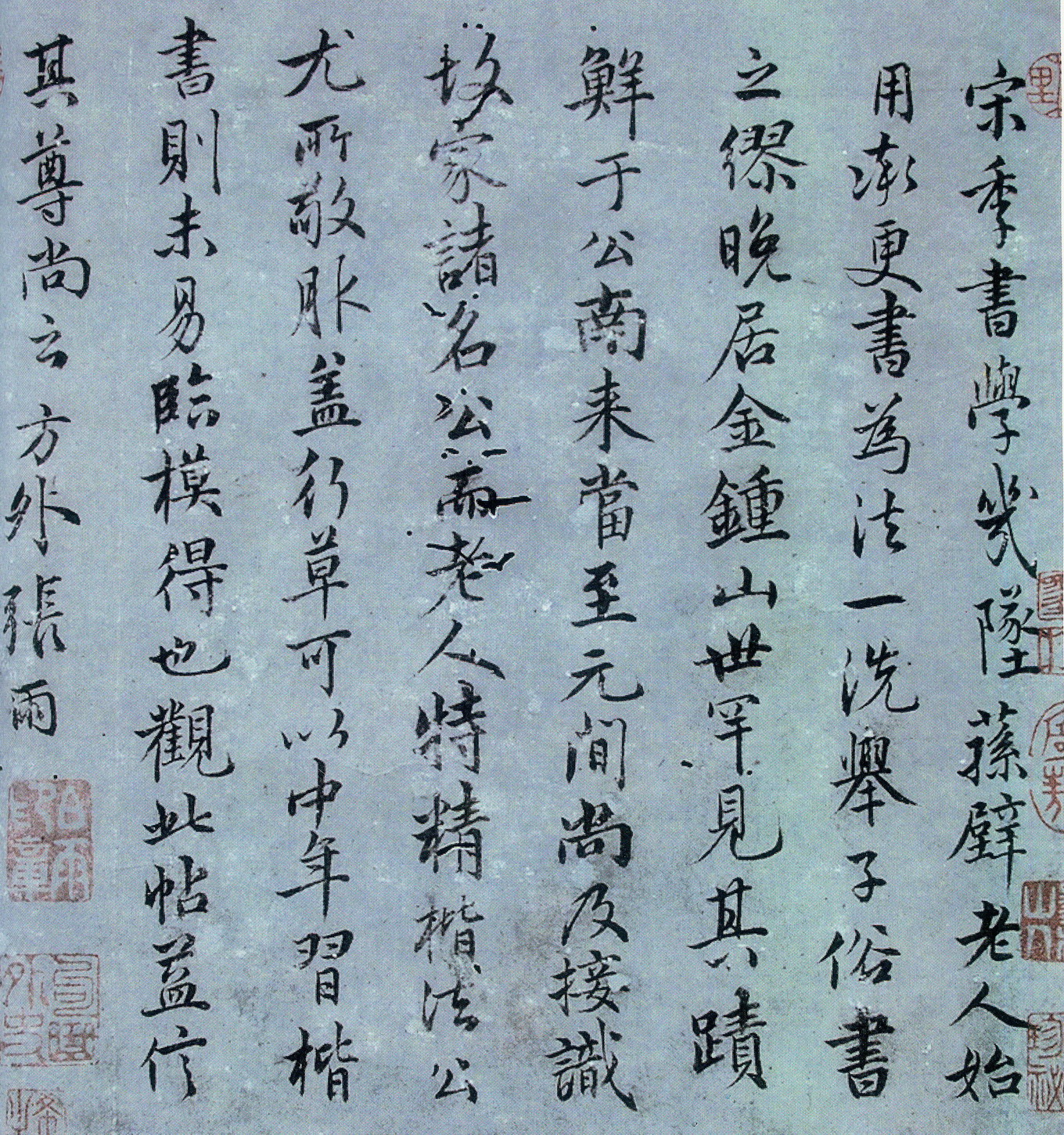 【释文】:宋季書學幾墜.荪壁老人始用率更書為法,一洗舉子俗書之(缪)谬。晚居金锺山,世罕見其蹟。鲜于公南來,當至元間,尚及接識故家諸名公,而老人特精楷法,公尤所敬服。盖行草可以中年習,楷書則未易臨模得也。觀此帖益信其尊尚云。方外張雨。
