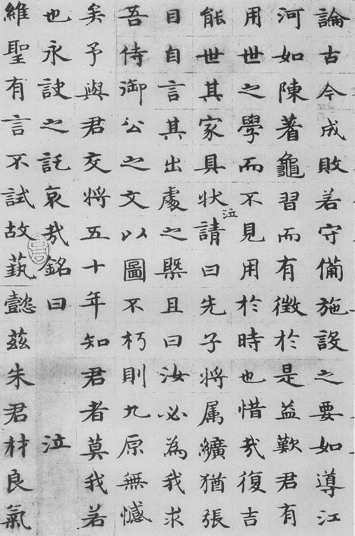 《周伯琦楷书朱德润墓志铭》纸本乌丝栏。款署“资政大夫江南诸道行御史台侍御史鄱阳周伯琦撰并书篆”,前有周氏篆額“有元儒学提举朱府君墓志铭”。帖上分钤“桂下史”、“ 伯沮父”、“ 鄱阳开国公侯之家”、“三世翰林”、“周”、“坚白”、“太史氏周伯琦”等周氏印记。骑缝有“合同”藏印。现藏故宫博物院。