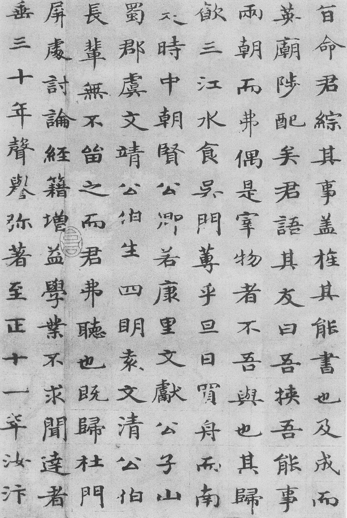 本篇是周伯琦为友人朱德润撰写的墓志铭。朱德润(1294—1365),字泽民。平江(今属江苏)人。工诗文,喜书札,善画山水、人物,是元代著名书画家。周伯琦与朱德润相交近五十年,情谊笃厚,文中详记朱氏生平事迹,同时寄托对友人缅怀之情。此篇楷书是周伯琦晚年佳作,苍劲古拙,功力精湛。