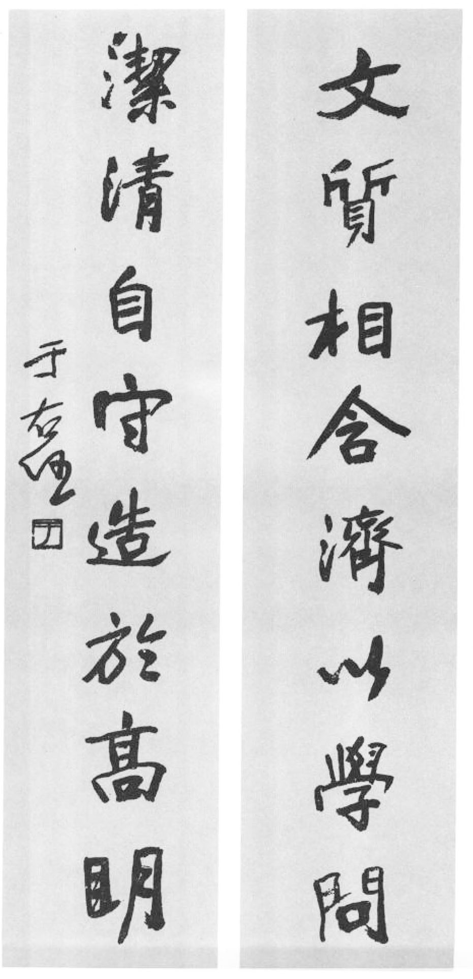 于右任《行书文质洁清八言联》纸本行书 133×33.5cm×2 释文:文质相含济以学问,洁清自守造于高明。 款署:于右任。 【资料来源】 《中国书法全集》-82-近现代于右任(荣宝斋出版社) 刊于台湾《于右任书法选集》