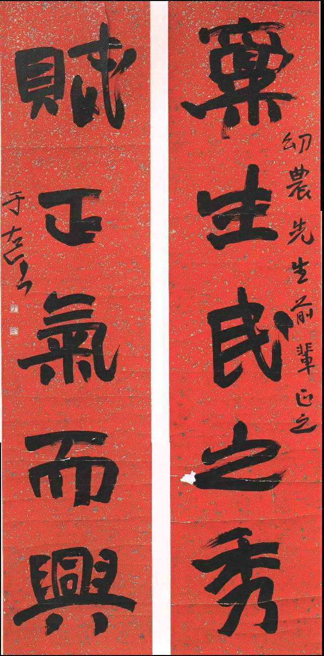 于右任《赠王典章行书禀生赋正五言联》资料不详 释文:禀生民之秀,赋正气而兴。 款署:幼农先生前辈正之。于右任。 王典章(1865—1943),字幼农,祖籍陕西,晚清秀才,以文韬武略享誉一时,与于右任为至交。“西安事变”中,王典章发挥了重要作用。