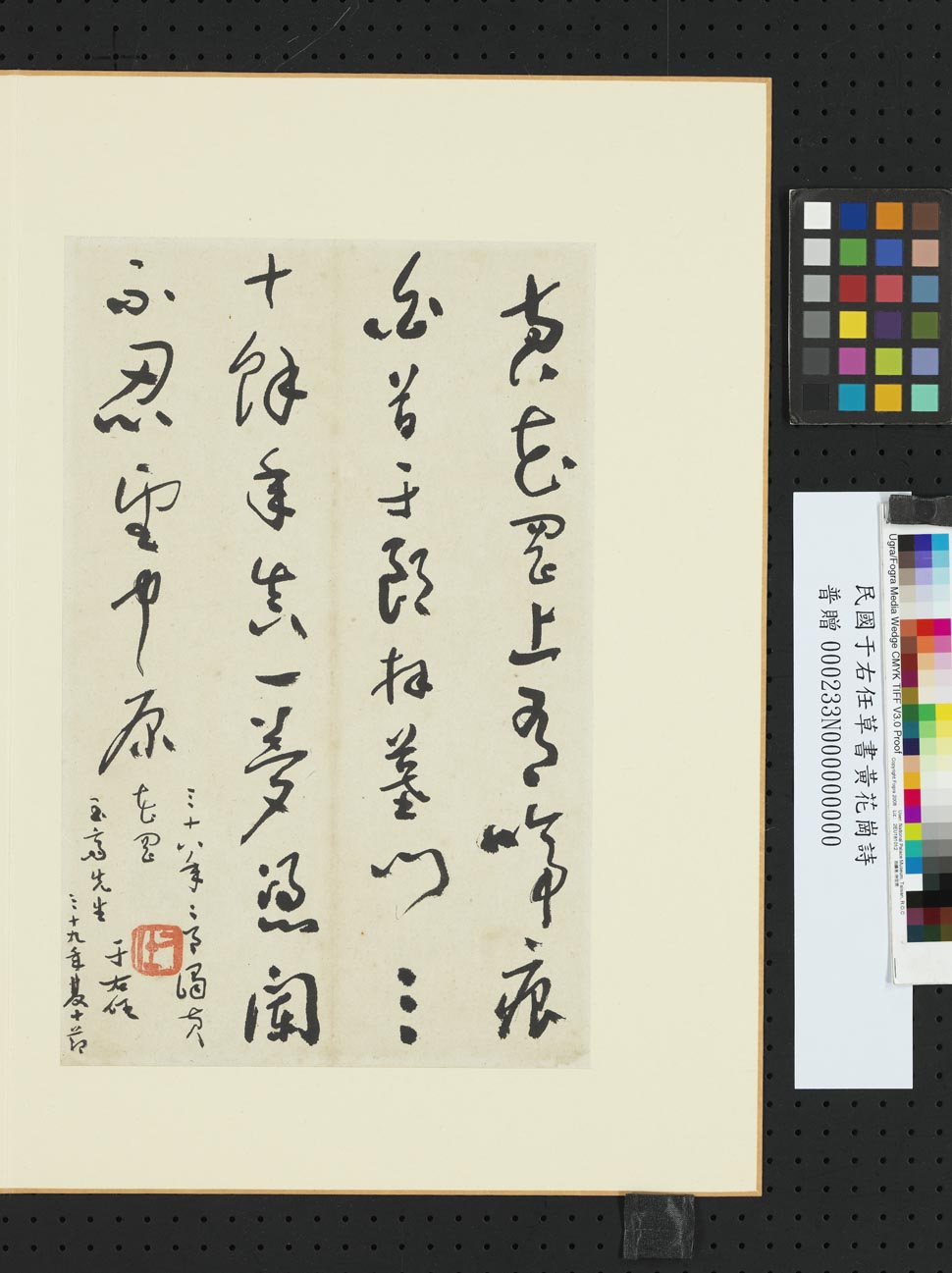 释文:黄花岗上有啼痕,白首于郎拜墓门。三十余年真一梦,凭栏不忍望中原。 款署:三十八年二月谒黄花岗。玉斋先生,于右任。三十九年双十节。 钤印:右任(朱文)
