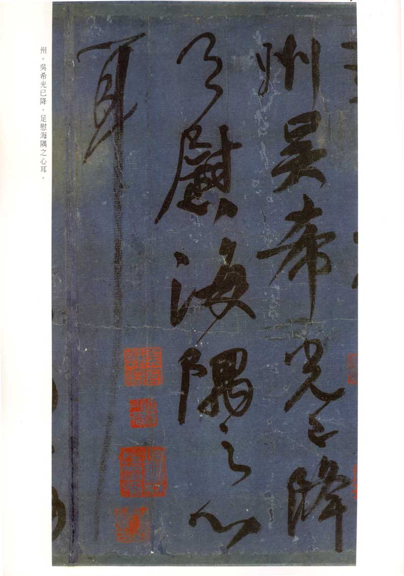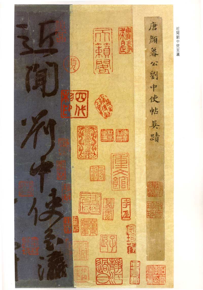 此帖又称《瀛州帖》,著录首见宋《宣和书谱》,无书写年月。《刘中使帖》是颜行草书中字体最大的。文曰:“近闻刘中使至瀛州,吴希光已降。足慰海隅之心耳。又闻磁州为卢子期所围,舍利将军擒获之。吁足慰也。”