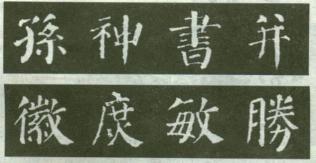 (二)主次分明,突出主笔。一是同—类笔画主笔厚重,即粗而繁(回折多转),次笔陪衬,轻而简(回折轻)。笔画有主有次,主次分明,给人以明快之感。例如图—“孙”、“神”、“书”、“并”字等。二是一个字中笔画间轻重反差较大,如横细竖粗、撇轻捺重等,图一例字都有此特点。三是多“部件”组成的字,疏重密轻,醒目可赏,如图二“徽”、“庶”、“敏”、“胜”字等。由于“宾主分明,主从有别”,使字显得瘦而劲健,肥而不笨。