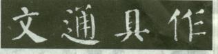 (五)宽舒圆满,雍容大度。《勤礼碑》除了厚重饱满的特点外,在结体上一反初唐楷书“字中收敛”之特点,以“平衡”为结体原则,体相称,势开张,字撑格,重心稳,貌端正。如图五“文”、“通”、“具”、“作”字等。总之,其结字对称平稳,笔势宽绰,大气磅礴,且宽博而不松散,神采丰足,实在令人叫绝。