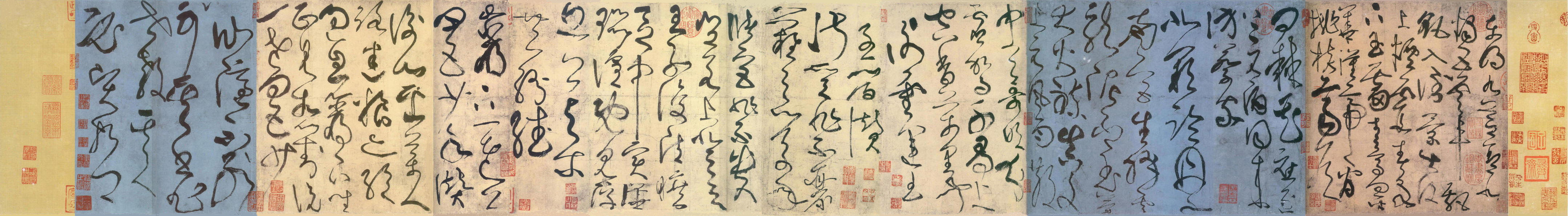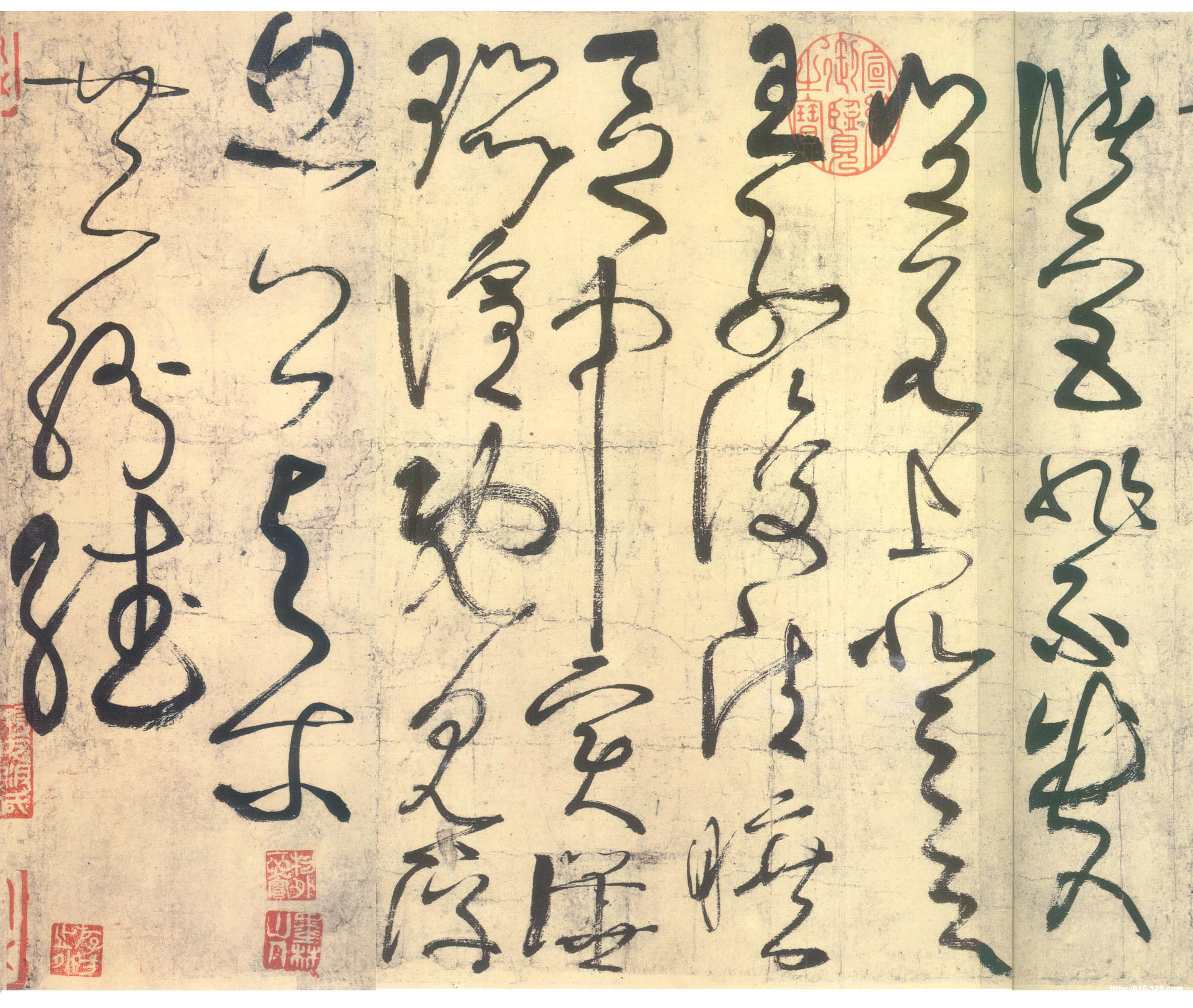 《草书古诗四首》(局部) 辽宁省博物馆藏,墨迹本,五色笺,凡四十行,一百八十八字。传为张旭狂草之作,极为珍贵。其内容,前两首是庾信的《步虚词》,后两首是南朝谢灵运的《王子晋赞》和《四五少年赞》(疑为伪托)。通篇笔画丰满,绝无纤弱浮滑之笔。行文跌宕起伏,动静交错,满纸如云烟缭绕,实乃草书颠峰之篇。今人郭子绪云:“《古诗四帖》,可以说是张旭全部生命的结晶,是天才美和自然美的典型,民族艺术的精华,永恒美的象征。”(《中国书法鉴赏大辞典》)