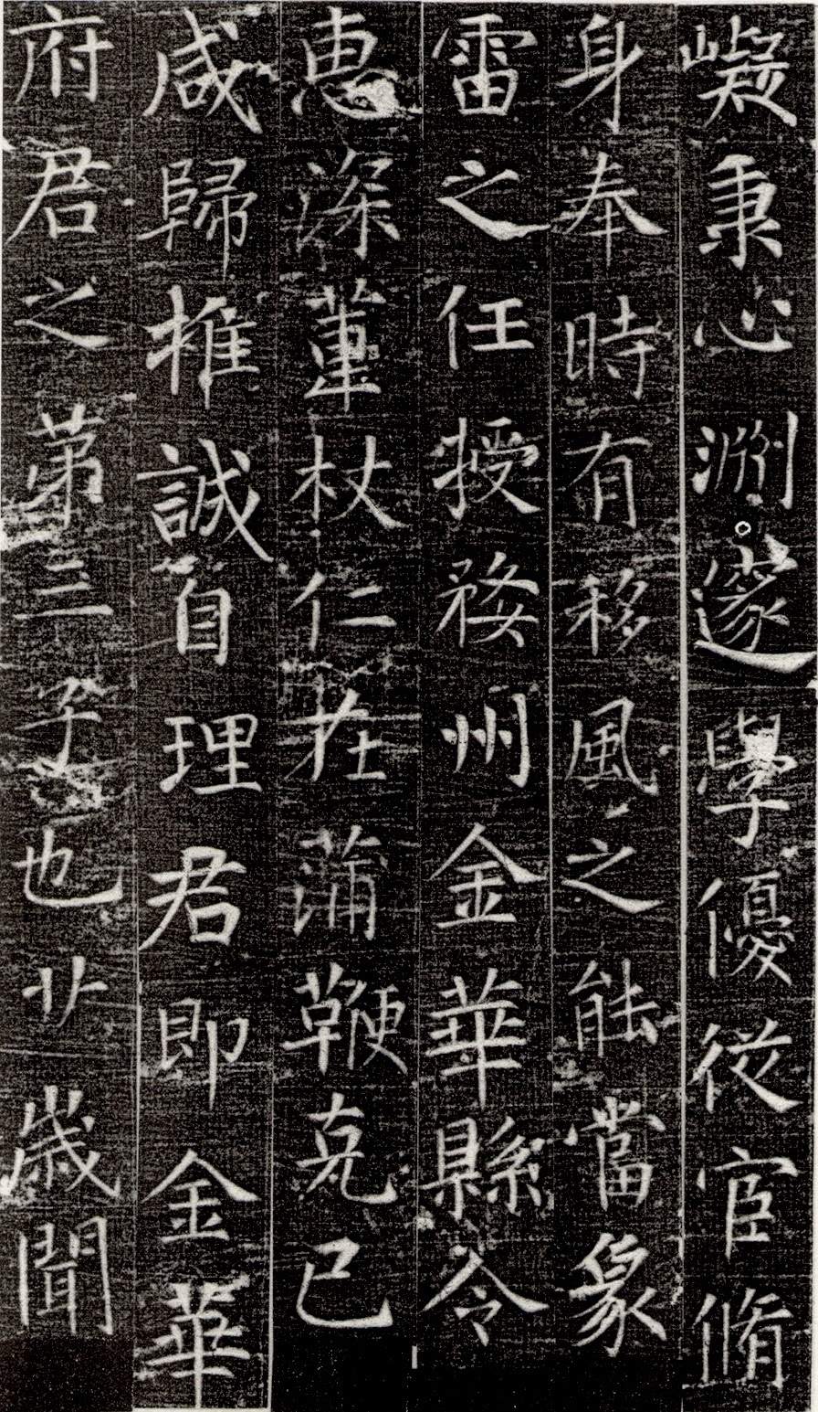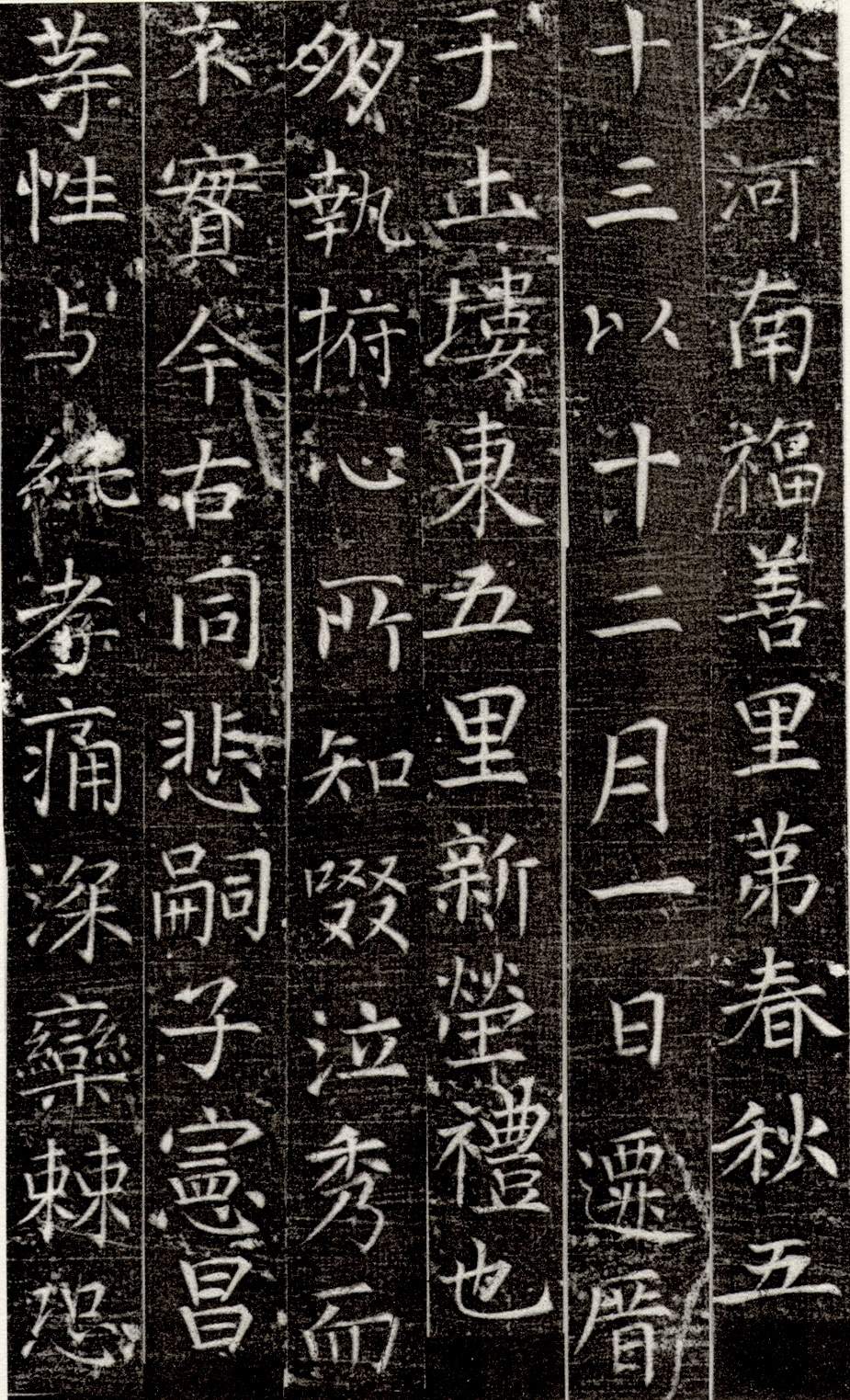 此碑于1992年元月发现于河南省洛阳市邙山脚下偃师县磷肥厂扩建改造工地发掘的一处唐墓。墓志青石质,有盖,近方形,右上角已残缺。横55,纵53厘米。志文楷书,共21行,满行21字,共计430字。此碑与《郎官石柱记》书写时间仅相隔一年,虽不如《郎官石柱记》浑厚,但字形方整,气息相通,也应系张旭所书。